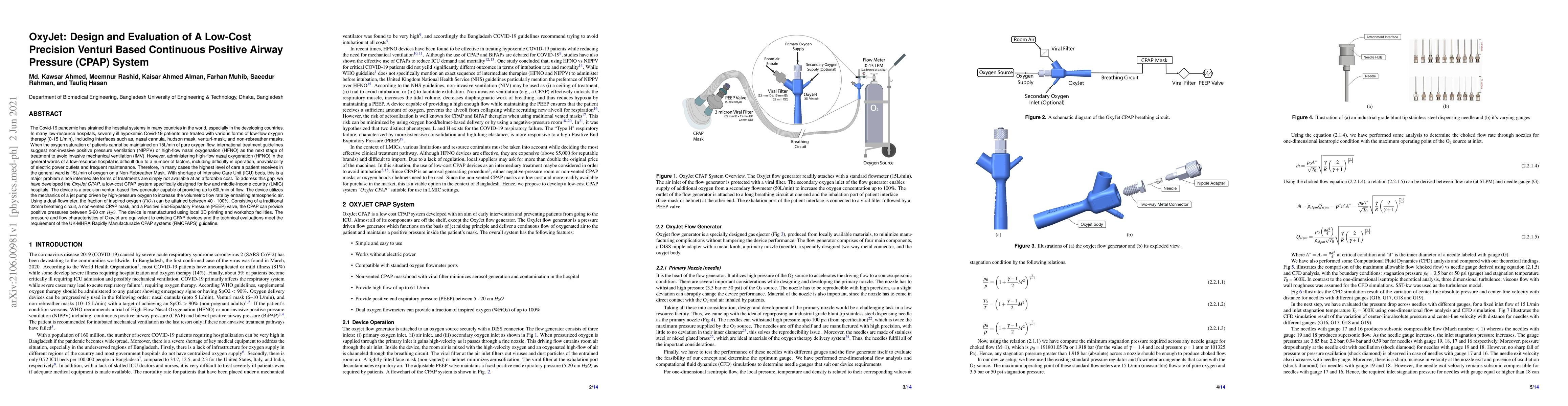 A low-cost CPAP system has been designed for low-resource hospitals to provide high-flow oxygen therapy, addressing a significant gap in care for severely ill COVID-19 patients. The device is manufactured using local 3D printing and workshop facilities, making it accessible to resource-constrained settings.