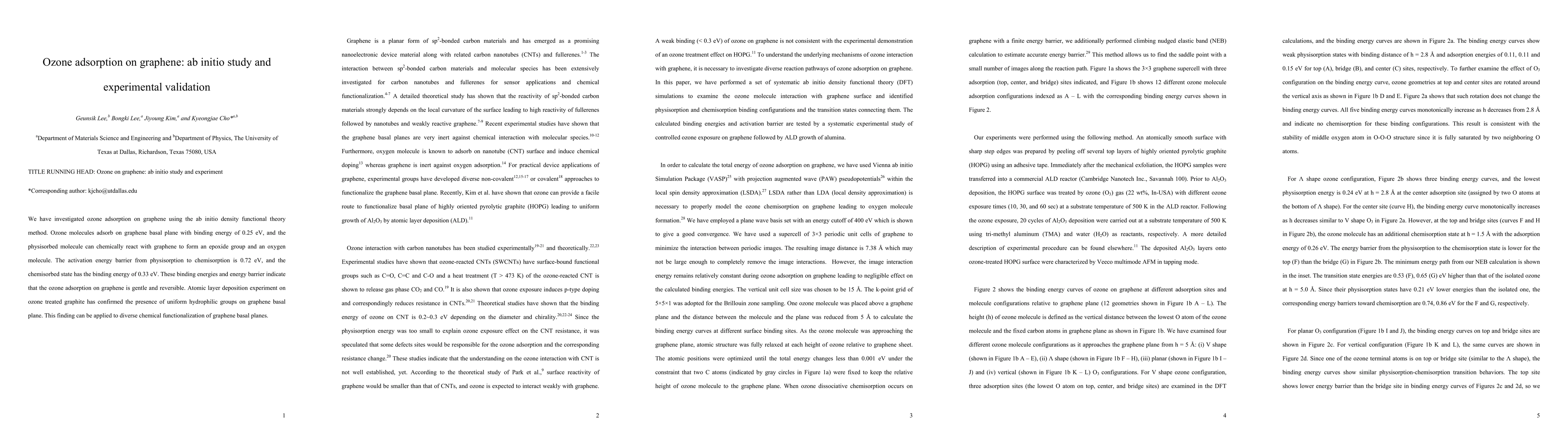 We have investigated ozone adsorption on graphene using the ab initio density functional theory method. Ozone molecules adsorb on graphene basal plane with binding energy of 0.25 eV, and the physisorbed molecule can chemically react with graphene to form an epoxide group and an oxygen molecule. The activation energy barrier from physisorption to chemisorption is 0.72 eV, and the chemisorbed state has the binding energy of 0.33 eV. These binding energies and energy barrier indicate that the ozone adsorption on graphene is gentle and reversible. Atomic layer deposition experiment on ozone treated graphite has confirmed the presence of uniform hydrophilic groups on graphene basal plane. This finding can be applied to diverse chemical functionalization of graphene basal planes.