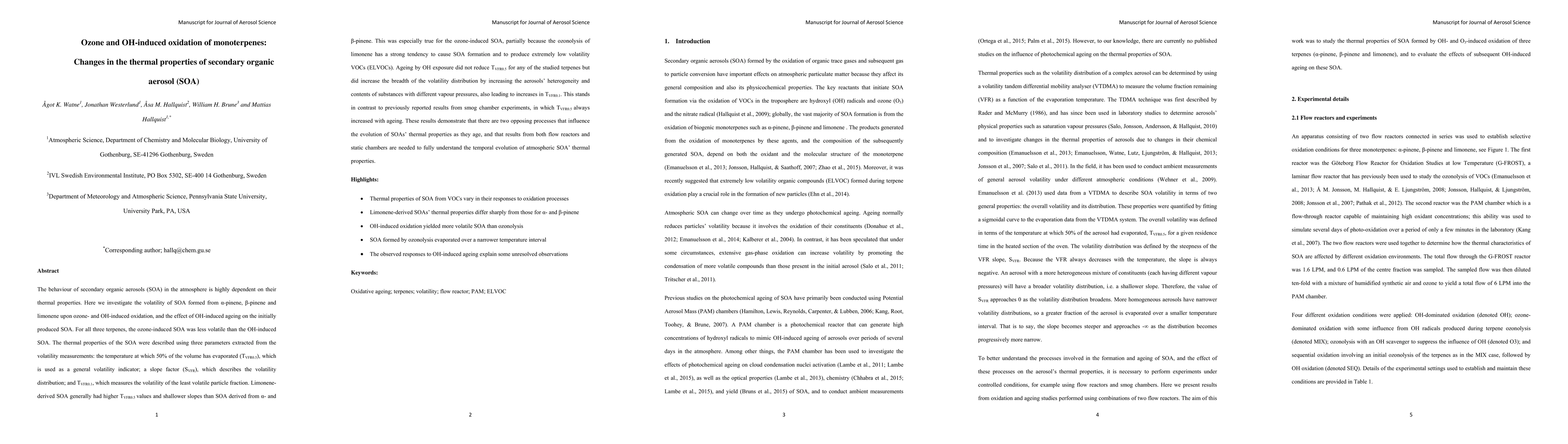 The behaviour of secondary organic aerosols (SOA) in the atmosphere is highly dependent on their thermal properties. Here we investigate the volatility of SOA formed from alpha-pinene, beta-pinene and limonene upon ozone- and OH-induced oxidation, and the effect of OH-induced ageing on the initially produced SOA. For all three terpenes, the ozone-induced SOA was less volatile than the OH-induced SOA. The thermal properties of the SOA were described using three parameters extracted from the volatility measurements: the temperature at which 50 per cent of the volume has evaporated (TVFR0.5), which is used as a general volatility indicator; a slope factor (SVFR), which describes the volatility distribution; and TVFR0.1, which measures the volatility of the least volatile particle fraction. Limonene-derived SOA generally had higher TVFR0.5 values and shallower slopes than SOA derived from alpha- and beta-pinene. This was especially true for the ozone-induced SOA, partially because the ozonolysis of limonene has a strong tendency to cause SOA formation and to produce extremely low volatility VOCs (ELVOCs). Ageing by OH exposure did not reduce TVFR0.5 for any of the studied terpenes but did increase the breadth of the volatility distribution by increasing the aerosols heterogeneity and contents of substances with different vapour pressures, also leading to increases in TVFR0.1. This stands in contrast to previously reported results from smog chamber experiments, in which TVFR0.5 always increased with ageing. These results demonstrate that there are two opposing processes that influence the evolution of SOAs thermal properties as they age, and that results from both flow reactors and static chambers are needed to fully understand the temporal evolution of atmospheric SOA thermal properties.
