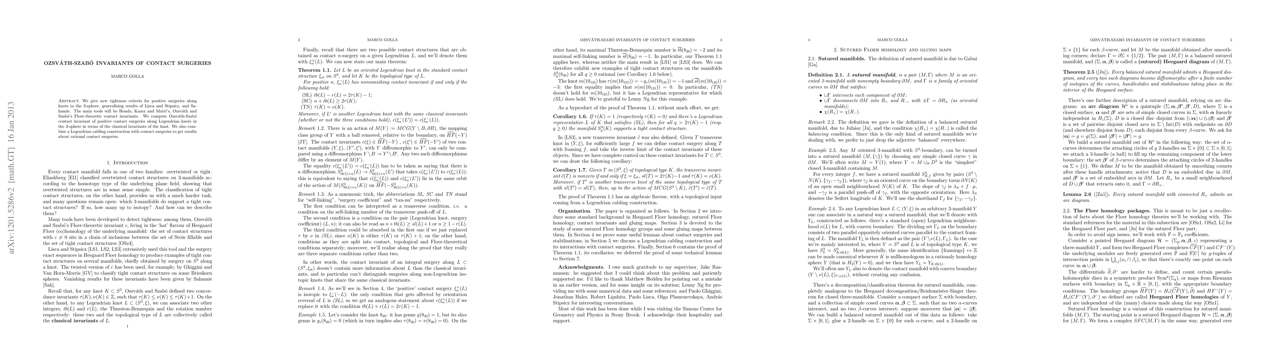 We give new tightness criteria for positive surgeries along knots in the 3-sphere, generalising results of Lisca and Stipsicz, and Sahamie. The main tools will be Honda, Kazez and Matic's, Ozsvath and Szabo's Floer-theoretic contact invariants. We compute the Ozsvath and Szabo's invariant of positive contact surgeries along Legendrian knots in the 3-sphere in terms of the classical invariants of the knot. We also combine a Legendrian cabling construction with contact surgeries to get results about rational contact surgeries.