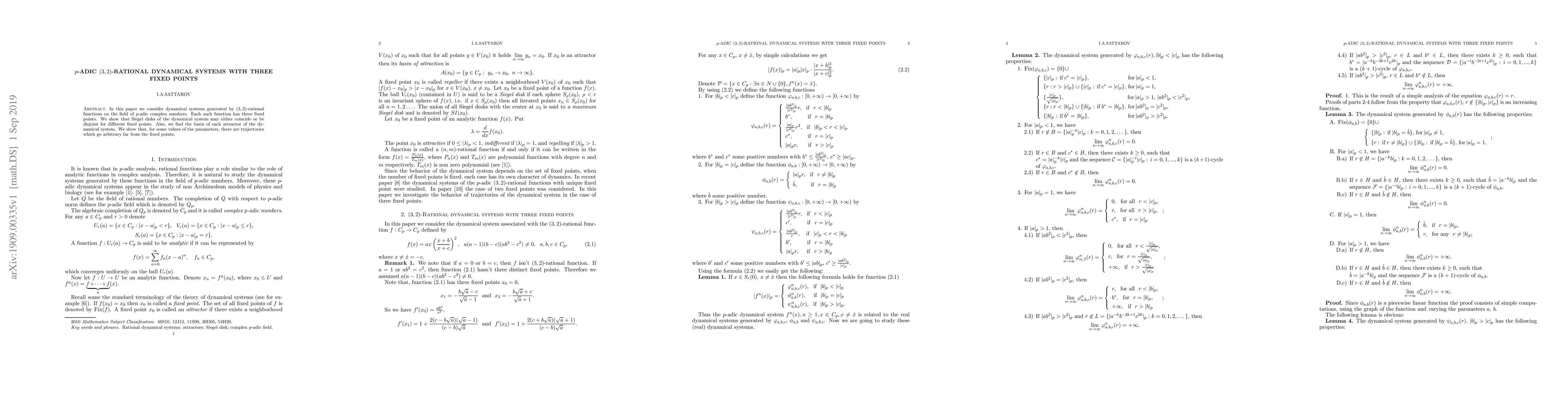 In this paper we consider dynamical systems generated by $(3,2)$-rational functions on the field of $p$-adic complex numbers. Each such function has three fixed points. We show that Siegel disks of the dynamical system may either coincide or be disjoint for different fixed points. Also, we find the basin of each attractor of the dynamical system. We show that, for some values of the parameters, there are trajectories which go arbitrary far from the fixed points.