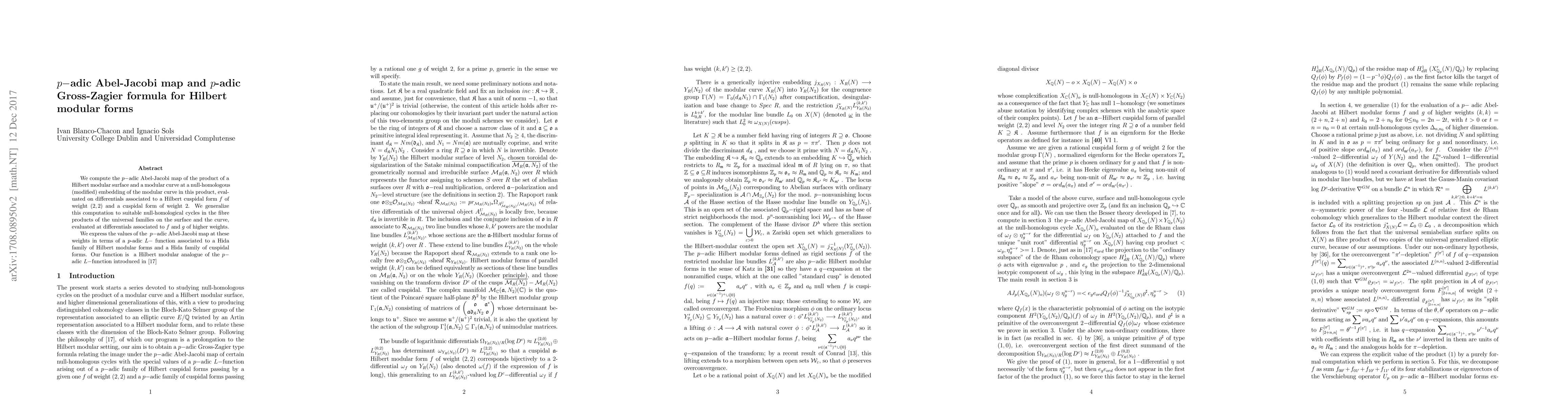 This paper computes the p-adic Abel-Jacobi map for Hilbert modular surfaces and modular curves, linking it to a p-adic L-function via differentials associated with cuspidal forms. It generalizes the computation to higher-weight forms and connects the results to a p-adic L-function inspired by Darmon and Rotger's work.