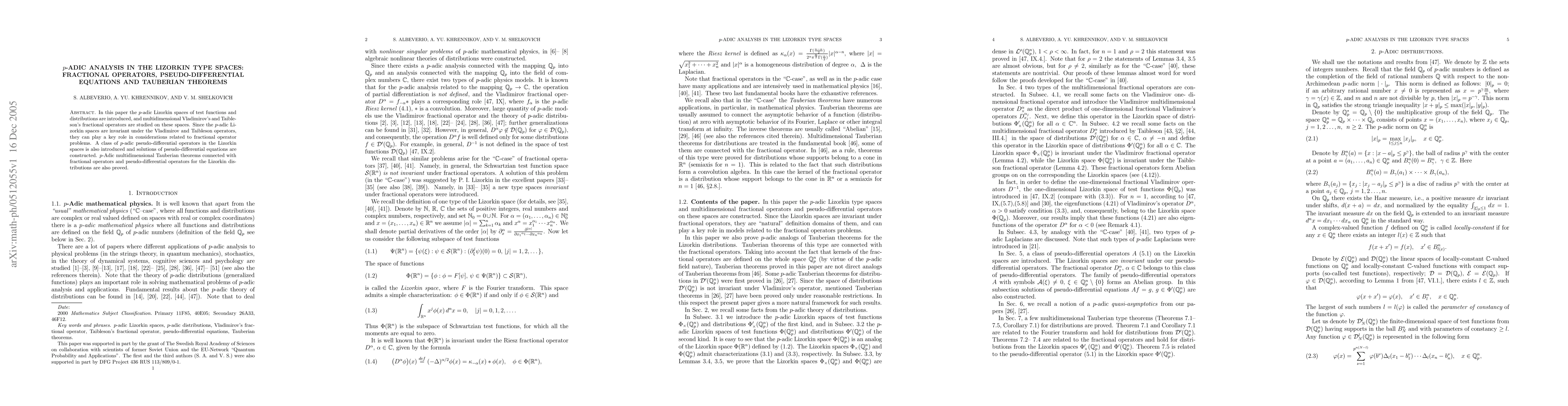This paper introduces p-adic Lizorkin spaces and studies fractional operators, pseudo-differential equations, and Tauberian theorems in these spaces, with implications for fractional operator problems and their connections to pseudo-differential operators.