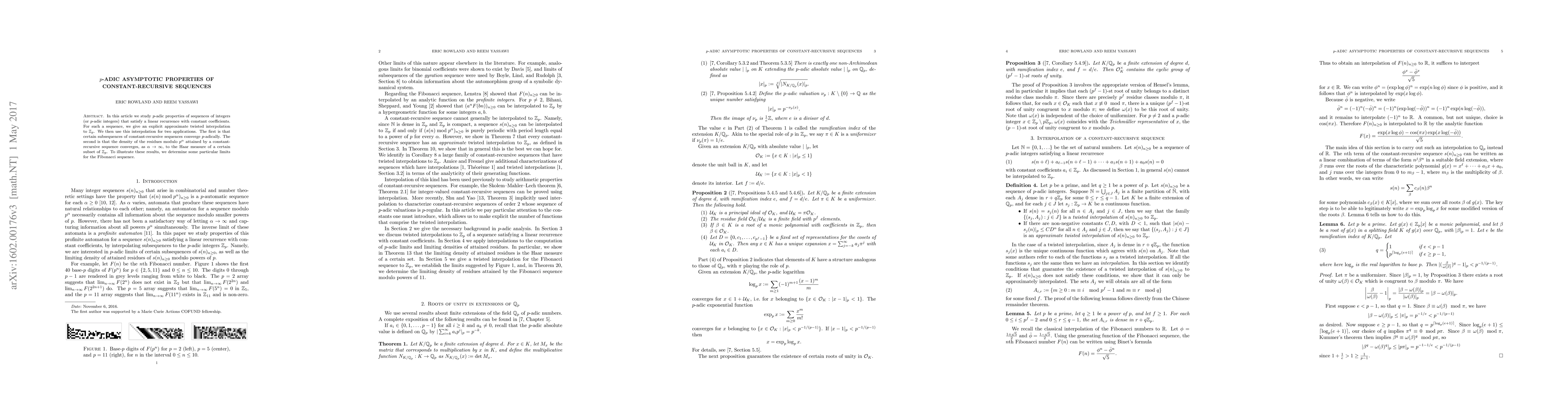 This paper investigates $p$-adic properties of constant-recursive integer sequences, providing an explicit interpolation to $\mathbb{Z}_p$. It demonstrates $p$-adic convergence of certain subsequences and the density convergence of residues modulo $p^\alpha$ to the Haar measure of a subset of $\mathbb{Z}_p$.