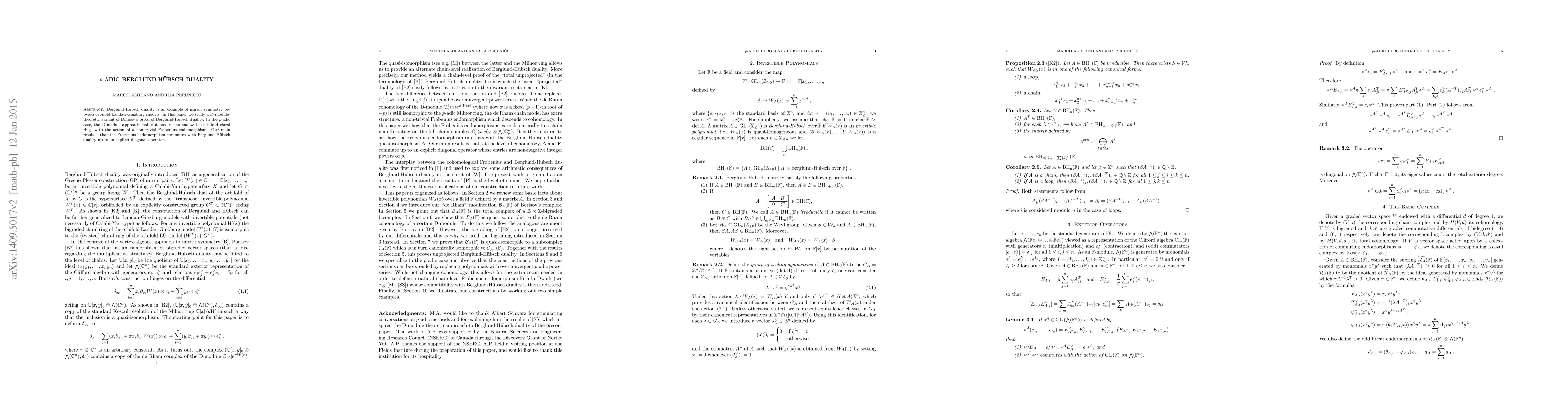 Berglund-H\"ubsch duality is an example of mirror symmetry between orbifold Landau-Ginzburg models. In this paper we study a D-module-theoretic variant of Borisov's proof of Berglund-H\"ubsch duality. In the $p$-adic case, the D-module approach makes it possible to endow the orbifold chiral rings with the action of a non-trivial Frobenius endomorphism. Our main result is that the Frobenius endomorphism commutes with Berglund-H\"ubsch duality up to an explicit diagonal operator.