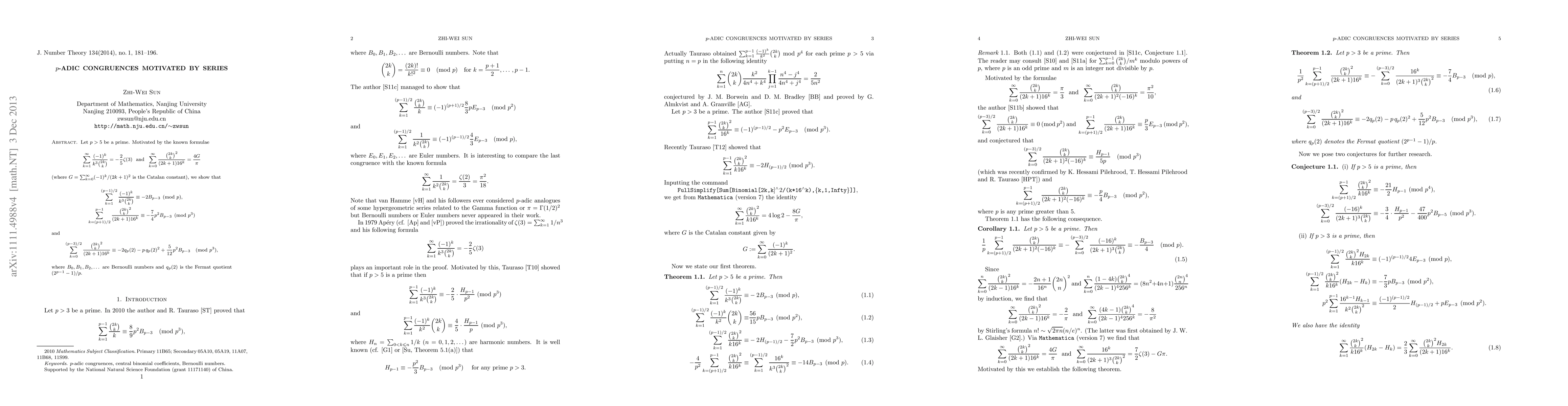 Let $p>5$ be a prime. Motivated by the known formulae $\sum_{k=1}^\infty(-1)^k/(k^3\binom{2k}{k})=-2\zeta(3)/5$ and $\sum_{k=0}^\infty \binom{2k}{k}^2/((2k+1)16^k)=4G/\pi$$ (where $G=\sum_{k=0}^\infty(-1)^k/(2k+1)^2$ is the Catalan constant), we show that $$\sum_{k=1}^{(p-1)/2}\frac{(-1)^k}{k^3\binom{2k}{k}}\equiv-2B_{p-3}\pmod{p},$$ $$\sum_{k=(p+1)/2}^{p-1}\frac{\binom{2k}{k}^2}{(2k+1)16^k}\equiv-\frac 7{4}p^2B_{p-3}\pmod{p^3}$$, and $$\sum_{k=0}^{(p-3)/2}\frac{\binom{2k}{k}^2}{(2k+1)16^k} \equiv-2q_p(2)-pq_p(2)^2+\frac{5}{12}p^2B_{p-3}\pmod{p^3},$$ where $B_0,B_1,\ldots$ are Bernoulli numbers and $q_p(2)$ is the Fermat quotient $(2^{p-1}-1)/p$.