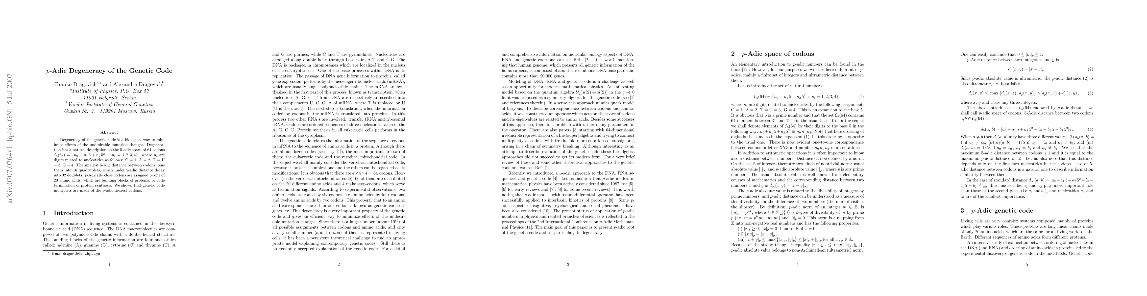 The paper introduces a p-adic ultrametric approach to describe genetic code degeneracy, revealing a structured clustering of codons into quadruplets and doublets.