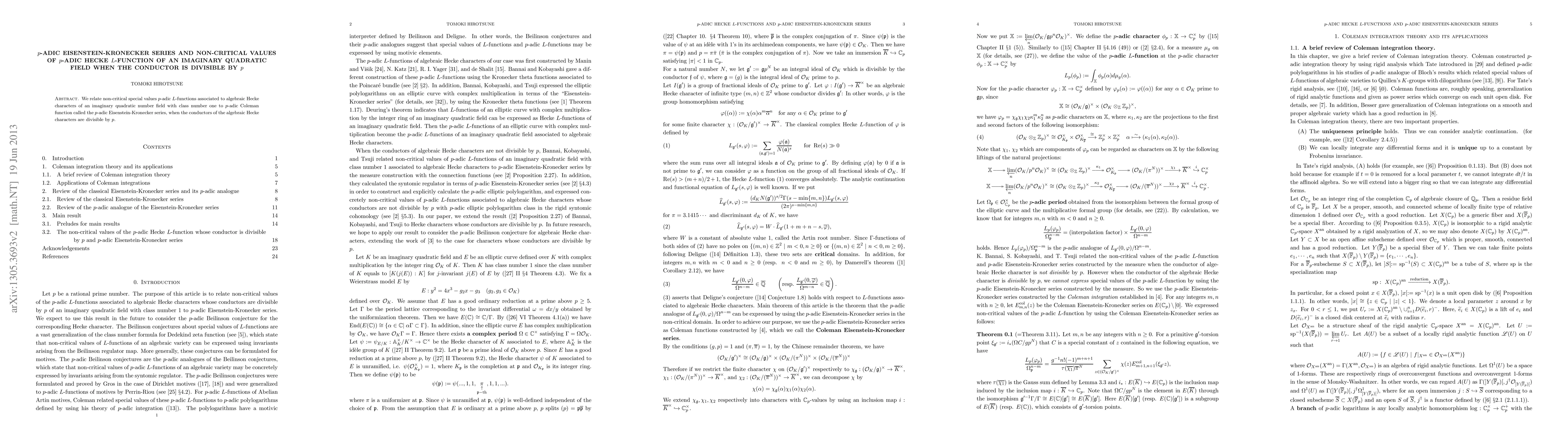 Summary: This paper connects non-critical values of $p$-adic Hecke $L$-functions to $p$-adic Eisenstein-Kronecker series when the conductors of algebraic Hecke characters are divisible by $p$, for imaginary quadratic fields with class number one.