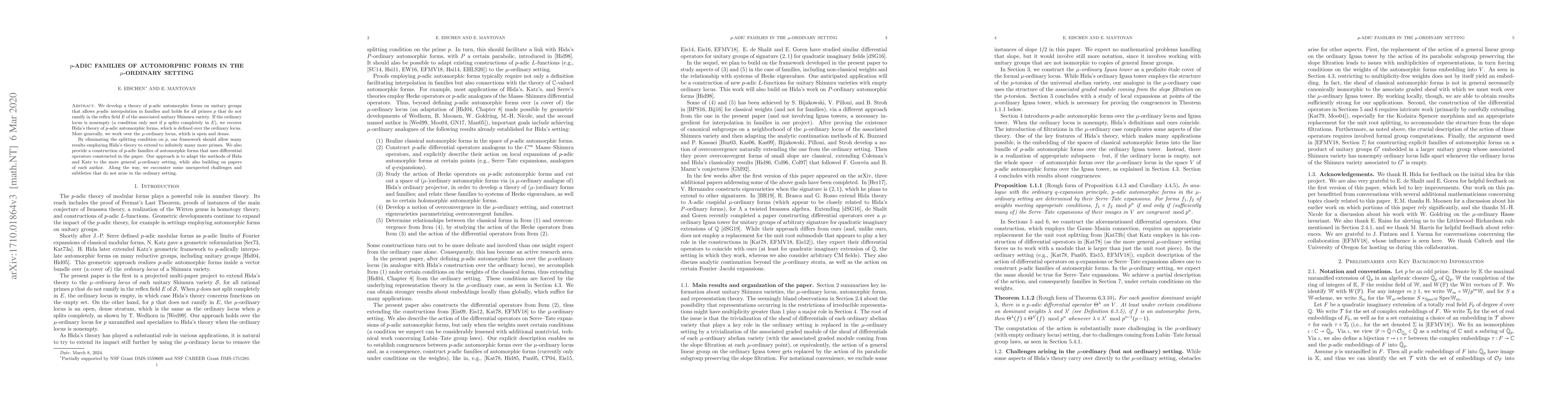 This paper develops a $p$-adic theory for automorphic forms on unitary groups, allowing interpolation in families without restricting $p$ to split completely in the reflex field. It extends Hida's theory to the $\mu$-ordinary setting, overcoming splitting conditions to potentially broaden applicability.