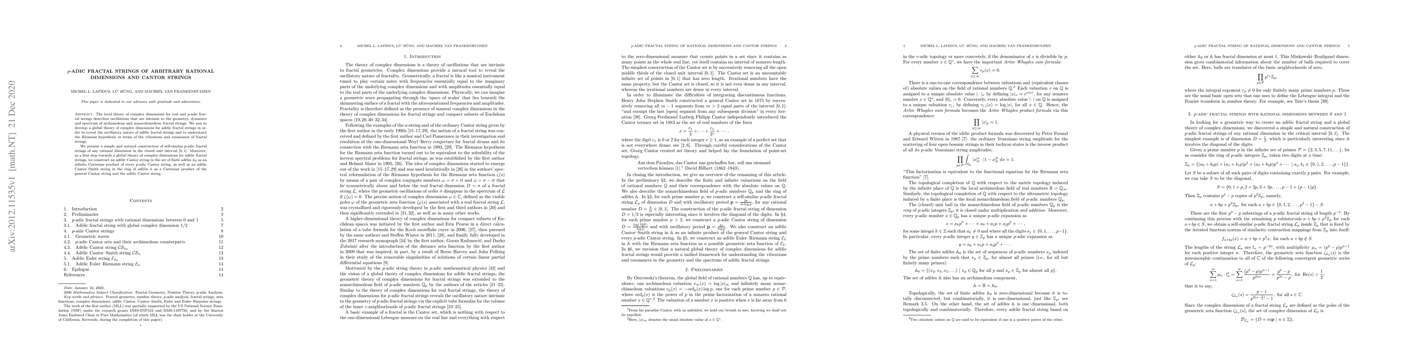 The local theory of complex dimensions for real and $p$-adic fractal strings describes oscillations that are intrinsic to the geometry, dynamics and spectrum of archimedean and nonarchimedean fractal strings. We aim to develop a global theory of complex dimensions for ad\`elic fractal strings in order to reveal the oscillatory nature of ad\`elic fractal strings and to understand the Riemann hypothesis in terms of the vibrations and resonances of fractal strings. We present a simple and natural construction of self-similar $p$-adic fractal strings of any rational dimension in the closed unit interval $[0,1]$. Moreover, as a first step towards a global theory of complex dimensions for ad\`elic fractal strings, we construct an ad\`elic Cantor string in the set of finite ad\`eles $\mathbb{A}_0$ as an infinite Cartesian product of every $p$-adic Cantor string, as well as an ad\`elic Cantor-Smith string in the ring of ad\`eles $\mathbb{A}$ as a Cartesian product of the general Cantor string and the ad\`elic Cantor string.