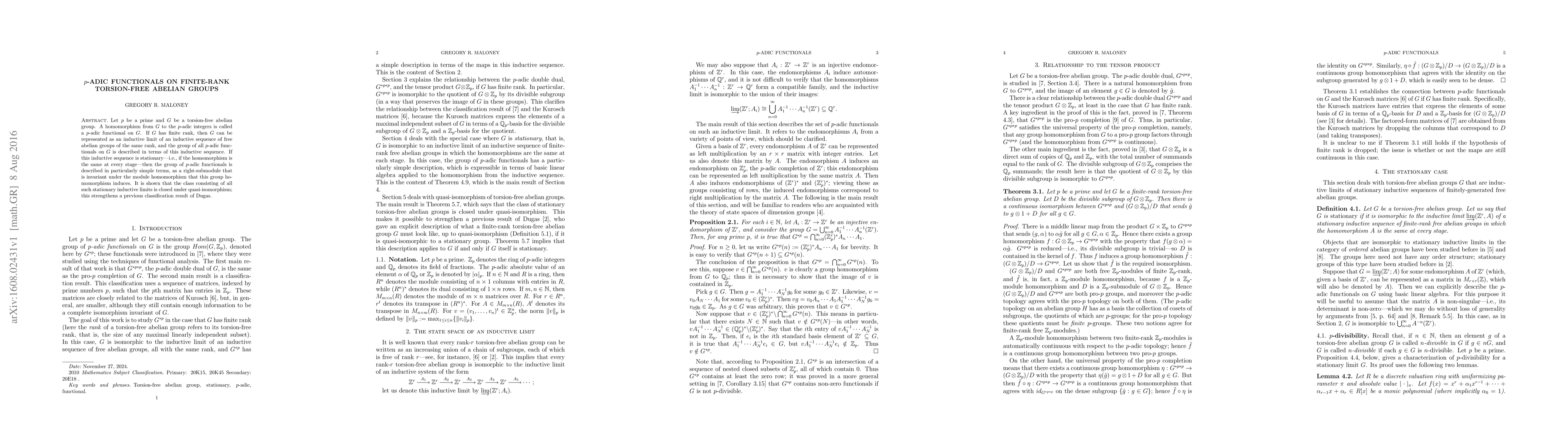 This paper investigates p-adic functionals on torsion-free abelian groups of finite rank, characterizing them through inductive sequences of free abelian groups. It shows that when these sequences are stationary, the group of p-adic functionals is a simple invariant submodule, and extends a prior classification result by proving the class of such groups is closed under quasi-isomorphism.
