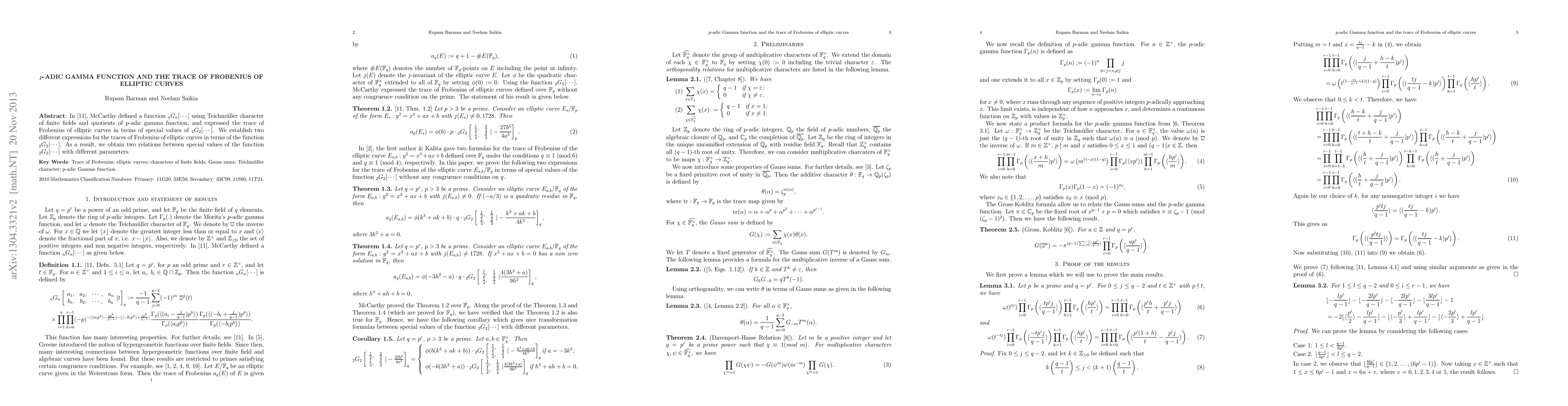 This paper defines a p-adic Gamma function and establishes two distinct expressions for the trace of Frobenius of elliptic curves using McCarthy's function $_{2}G_{2}[\cdots]$. It reveals two new relations between special values of this function with different parameters.