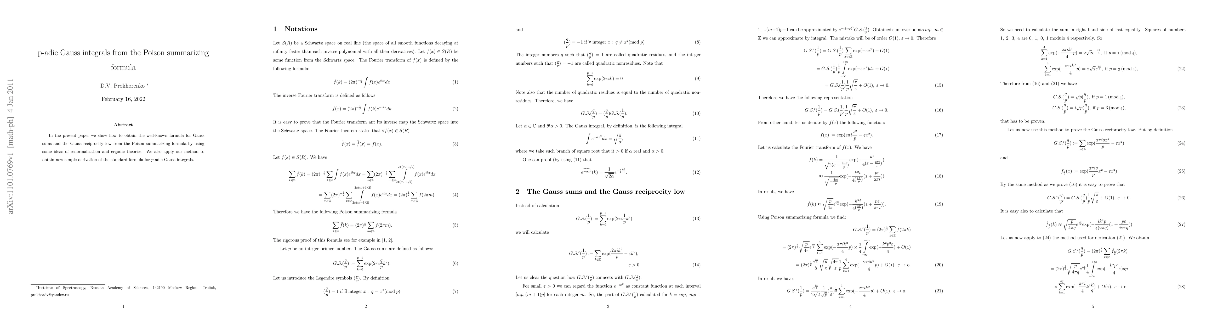 This paper demonstrates how to derive Gauss sums and the Gauss reciprocity law from the Poisson summarizing formula, employing renormalization and ergodic theory concepts. It also introduces a new, straightforward method for deriving the standard formula for p-adic Gauss integrals.