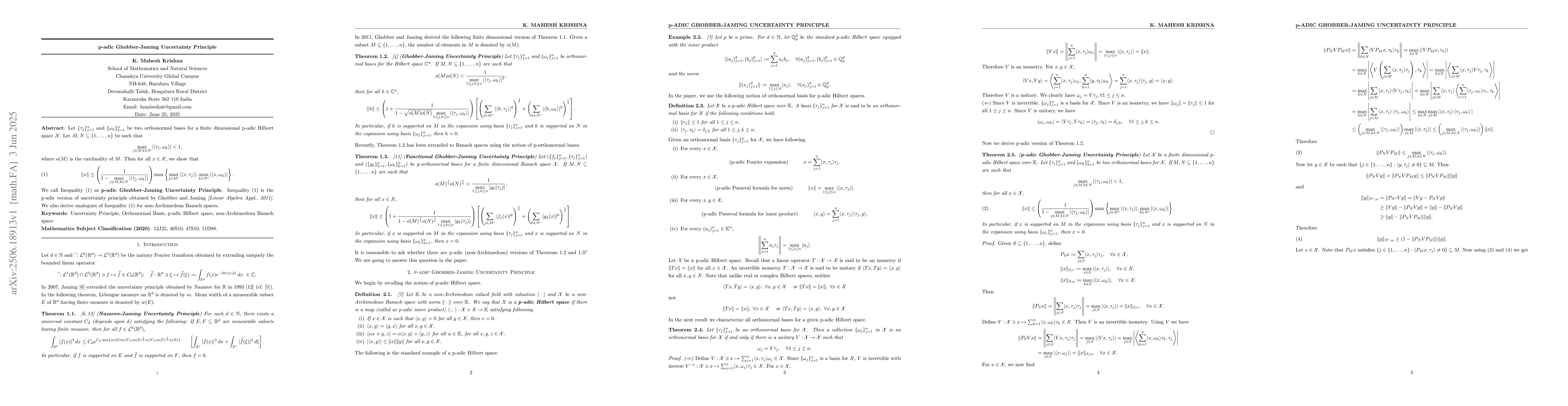 Let $\{\tau_j\}_{j=1}^n$ and $\{\omega_k\}_{k=1}^n$ be two orthonormal bases for a finite dimensional p-adic Hilbert space $\mathcal{X}$. Let $M,N\subseteq \{1, \dots, n\}$ be such that \begin{align*} \displaystyle \max_{j \in M, k \in N}|\langle \tau_j, \omega_k \rangle|<1, \end{align*} where $o(M)$ is the cardinality of $M$. Then for all $x \in \mathcal{X}$, we show that \begin{align} (1) \quad \quad \quad \quad \|x\|\leq \left(\frac{1}{1-\displaystyle \max_{j \in M, k \in N}|\langle \tau_j, \omega_k \rangle|}\right)\max\left\{\displaystyle \max_{j \in M^c}|\langle x, \tau_j\rangle |, \displaystyle \max_{k \in N^c}|\langle x, \omega_k\rangle |\right\}. \end{align} We call Inequality (1) as \textbf{p-adic Ghobber-Jaming Uncertainty Principle}. Inequality (1) is the p-adic version of uncertainty principle obtained by Ghobber and Jaming \textit{[Linear Algebra Appl., 2011]}. We also derive analogues of Inequality (1) for non-Archimedean Banach spaces.
