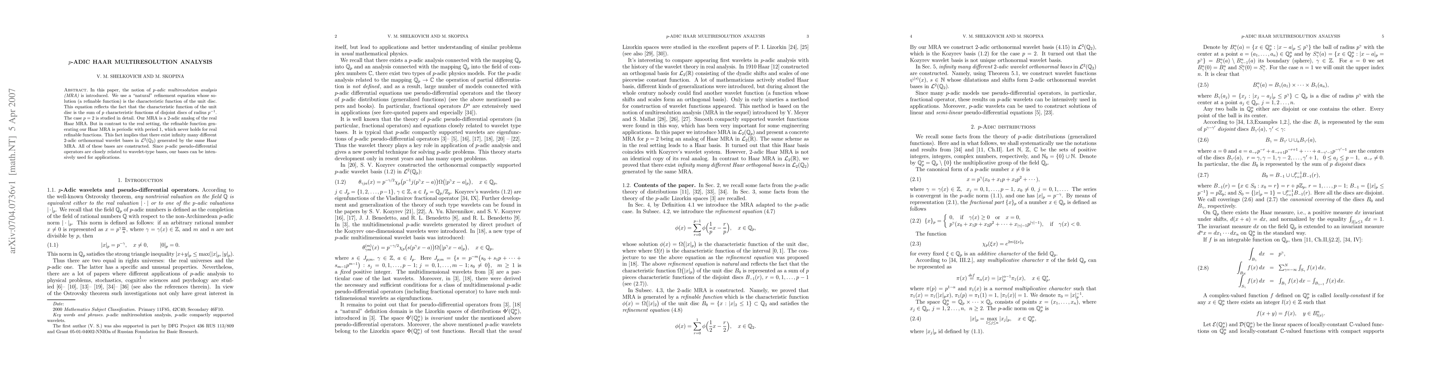 In this paper, the notion of {\em $p$-adic multiresolution analysis (MRA)} is introduced. We use a ``natural'' refinement equation whose solution (a refinable function) is the characteristic function of the unit disc. This equation reflects the fact that the characteristic function of the unit disc is the sum of $p$ characteristic functions of disjoint discs of radius $p^{-1}$. The case $p=2$ is studied in detail. Our MRA is a 2-adic analog of the real Haar MRA. But in contrast to the real setting, the refinable function generating our Haar MRA is periodic with period 1, which never holds for real refinable functions. This fact implies that there exist infinity many different 2-adic orthonormal wavelet bases in ${\cL}^2(\bQ_2)$ generated by the same Haar MRA. All of these bases are constructed. Since $p$-adic pseudo-differential operators are closely related to wavelet-type bases, our bases can be intensively used for applications.