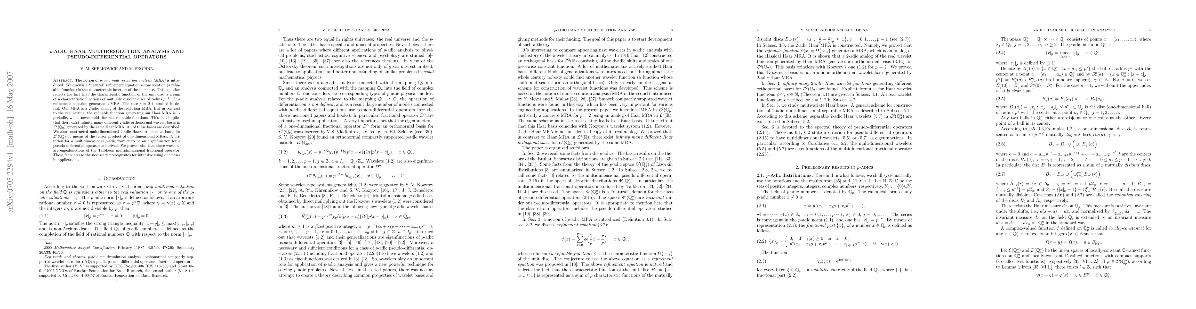 The notion of {\em $p$-adic multiresolution analysis (MRA)} is introduced. We discuss a ``natural'' refinement equation whose solution (a refinable function) is the characteristic function of the unit disc. This equation reflects the fact that the characteristic function of the unit disc is a sum of $p$ characteristic functions of mutually disjoint discs of radius $p^{-1}$. This refinement equation generates a MRA. The case $p=2$ is studied in detail. Our MRA is a 2-adic analog of the real Haar MRA. But in contrast to the real setting, the refinable function generating our Haar MRA is 1-periodic, which never holds for real refinable functions. This fact implies that there exist infinity many different 2-adic orthonormal wavelet bases in ${\cL}^2(\bQ_2)$ generated by the same Haar MRA. All of these bases are described. We also constructed multidimensional 2-adic Haar orthonormal bases for ${\cL}^2(\bQ_2^n)$ by means of the tensor product of one-dimensional MRAs. A criterion for a multidimensional $p$-adic wavelet to be an eigenfunction for a pseudo-differential operator is derived. We proved also that these wavelets are eigenfunctions of the Taibleson multidimensional fractional operator. These facts create the necessary prerequisites for intensive using our bases in applications.