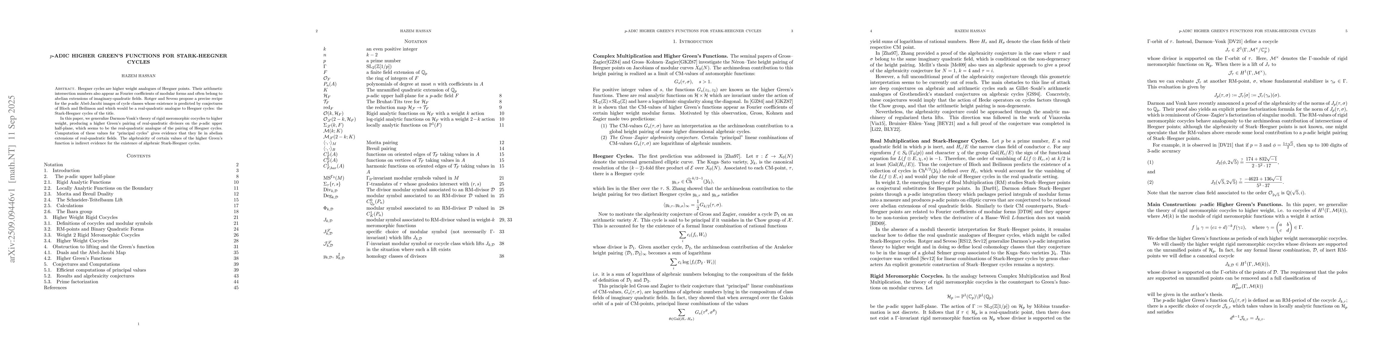 Heegner cycles are higher weight analogues of Heegner points. Their arithmetic intersection numbers also appear as Fourier coefficients of modular forms and often belong to abelian extensions of imaginary-quadratic fields. Rotger and Seveso propose a precise recipe for the $p$-adic Abel-Jacobi images of cycle classes whose existence is predicted by conjectures of Bloch and Beilinson and which would be a real-quadratic analogue to Heegner cycles: the Stark-Heegner cycles of the title. In this paper, we generalize Darmon-Vonk's theory of rigid meromorphic cocycles to higher weight, producing a higher Green's pairing of real-quadratic divisors on the $p$-adic upper half-plane, which seems to be the real-quadratic analogue of the pairing of Heegner cycles. Computation of these values for "principal cycles'' gives evidence that they lie in abelian extensions of real-quadratic fields. The algebraicity of certain values of the higher Green's function is indirect evidence for the existence of algebraic Stark-Heegner cycles.