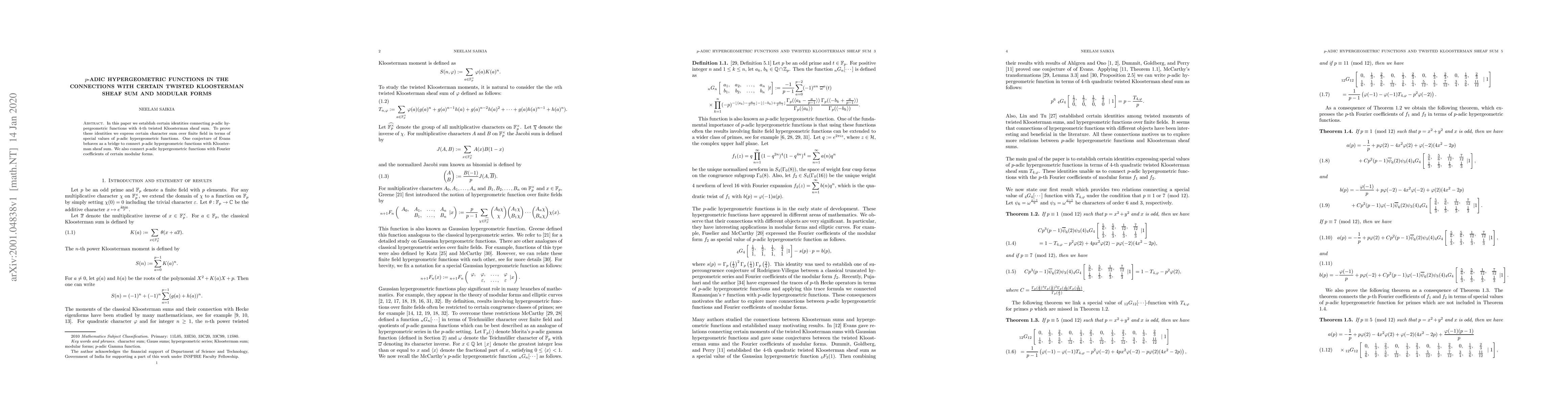This paper establishes identities linking $p$-adic hypergeometric functions to the 4th twisted Kloosterman sheaf sum, using special values of the former to express character sums over finite fields. It leverages Evans' conjecture to bridge these connections and also relates $p$-adic hypergeometric functions to the Fourier coefficients of certain modular forms.