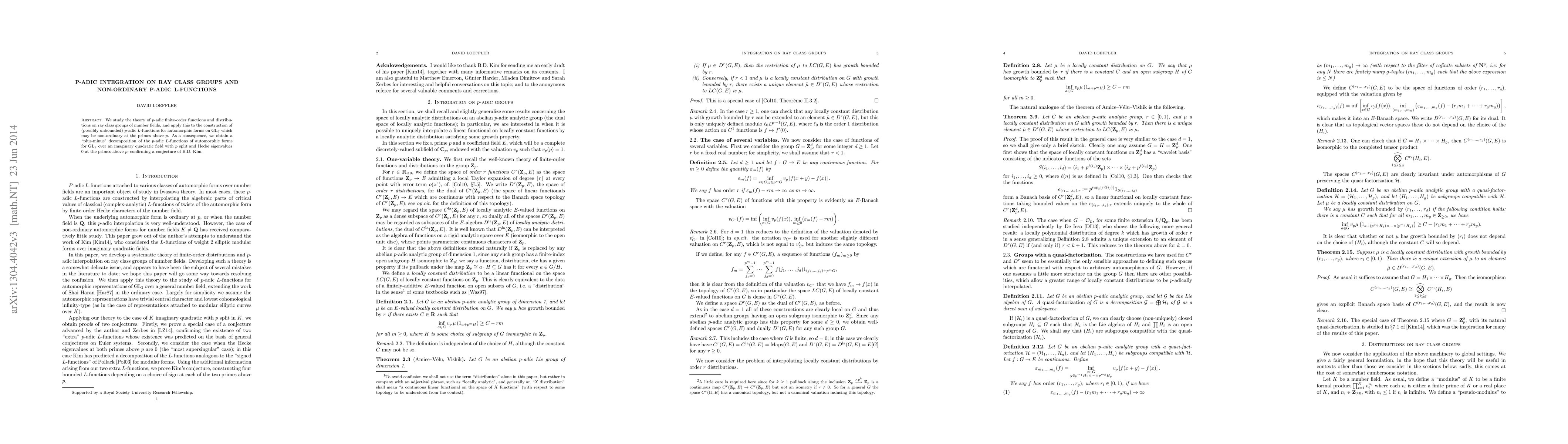 We study the theory of finite-order p-adic functions and distributions on ray class groups of number fields, and apply this to the construction of (possibly unbounded) p-adic L-functions for automorphic forms on GL(2) which may be non-ordinary at the primes above p. As a consequence, we obtain a "plus-minus" decomposition of the p-adic L-functions of automorphic forms for GL(2) over an imaginary quadratic field with p split and Hecke eigenvalues 0 at the primes above p, confirming a conjecture of B.D. Kim.