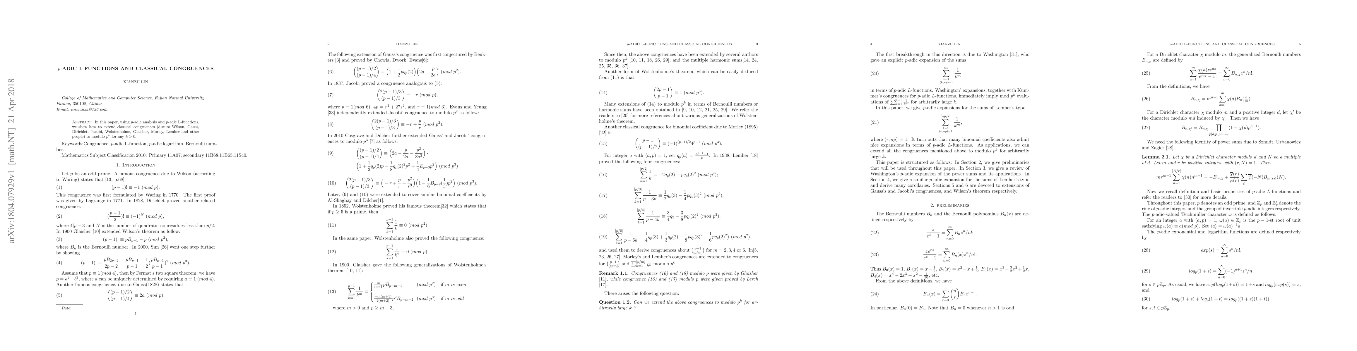 This paper extends classical congruences to modulo $p^k$ for any $k>0$ using $p$-adic analysis and $p$-adic L-functions. It builds on historical results from Wilson, Gauss, Dirichlet, Jacobi, and others.