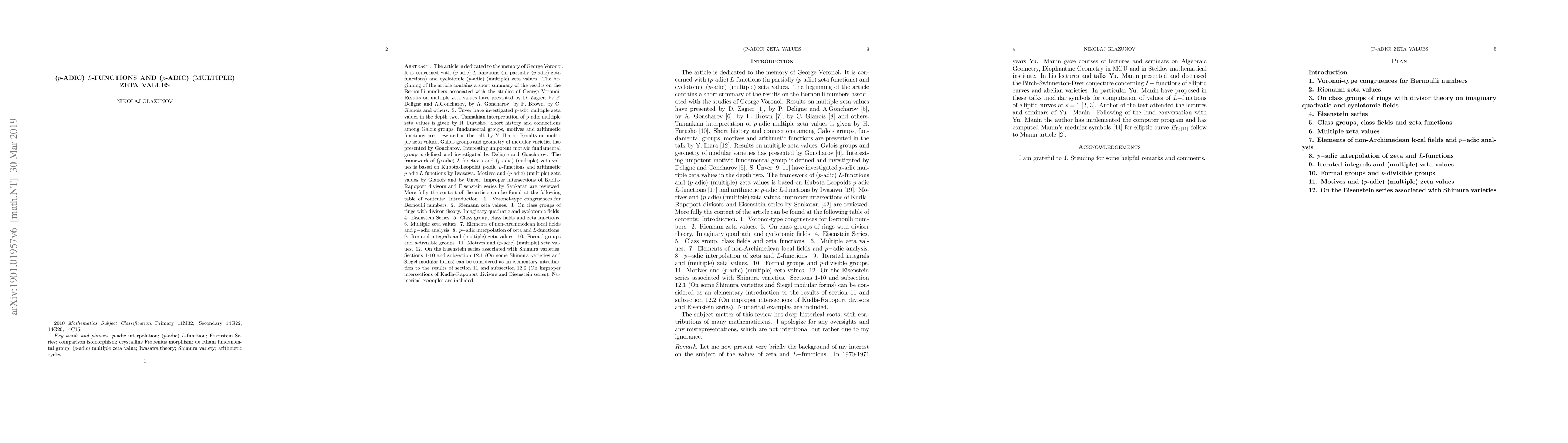 The article is dedicated to the memory of George Voronoi. It is concerned with ($p$-adic) $L$-functions (in partially ($p$-adic) zeta functions) and cyclotomic ($p$-adic) (multiple) zeta values. The beginning of the article contains a short summary of the results on the Bernoulli numbers associated with the studies of George Voronoi. Results on multiple zeta values have presented by D. Zagier, by P. Deligne and A.Goncharov, by A. Goncharov, by F. Brown, by C. Glanois and others. S. \"Unver have investigated p-adic multiple zeta values in the depth two. Tannakian interpretation of p-adic multiple zeta values is given by H. Furusho. Short history and connections among Galois groups, fundamental groups, motives and arithmetic functions are presented in the talk by Y. Ihara. Results on multiple zeta values, Galois groups and geometry of modular varieties has presented by Goncharov. Interesting unipotent motivic fundamental group is defined and investigated by Deligne and Goncharov. The framework of ($p$-adic) $L$-functions and ($p$-adic) (multiple) zeta values is based on Kubota-Leopoldt $p$-adic $L$-functions and arithmetic $p$-adic $L$-functions by Iwasawa. Motives and ($p$-adic) (multiple) zeta values by Glanois and by \"Unver, improper intersections of Kudla-Rapoport divisors and Eisenstein series by Sankaran are reviewed. More fully the content of the article can be found at the following table of contents (plan). Numerical examples are included.