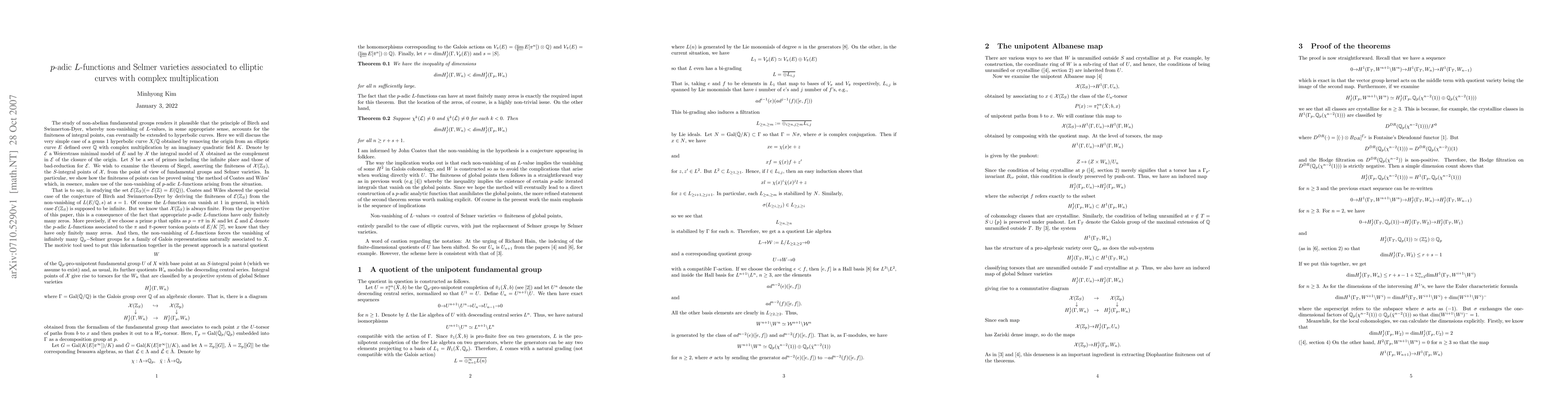 We show how non-vanishing of p-adic L functions controls the dimensions of Selmer varieties associated to the complement of the origin in an elliptic curve with CM. As a corollary, one obtains a \pi_1-proof of the theorem of Siegel for such curves.