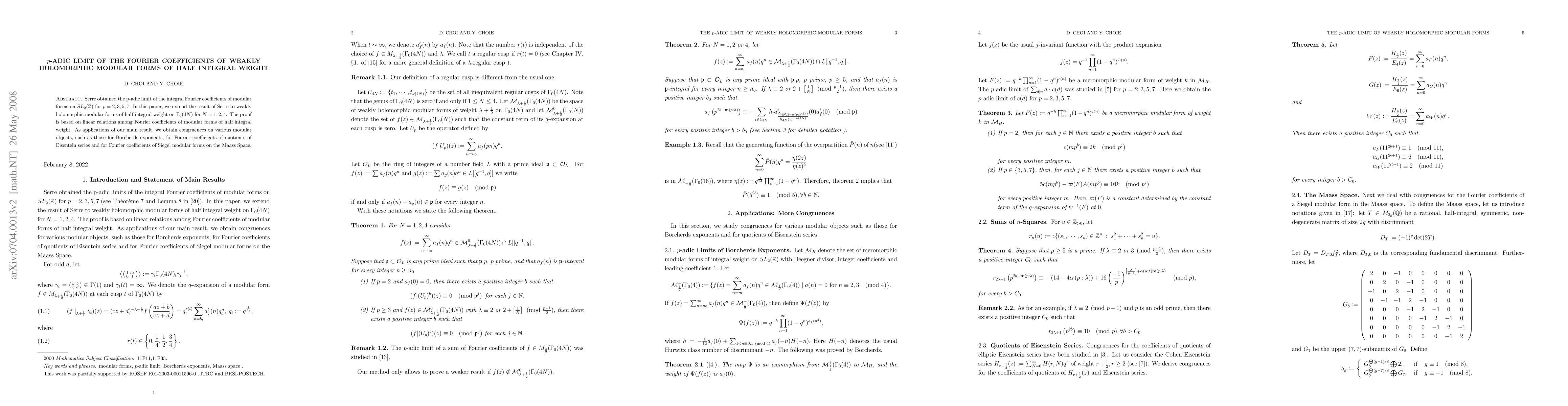 Serre obtained the p-adic limit of the integral Fourier coefficient of modular forms on $SL_2(\mathbb{Z})$ for $p=2,3,5,7$. In this paper, we extend the result of Serre to weakly holomorphic modular forms of half integral weight on $\Gamma_{0}(4N)$ for $N=1,2,4$. A proof is based on linear relations among Fourier coefficients of modular forms of half integral weight. As applications we obtain congruences of Borcherds exponents, congruences of quotient of Eisentein series and congruences of values of $L$-functions at a certain point are also studied. Furthermore, the congruences of the Fourier coefficients of Siegel modular forms on Maass Space are obtained using Ikeda lifting.