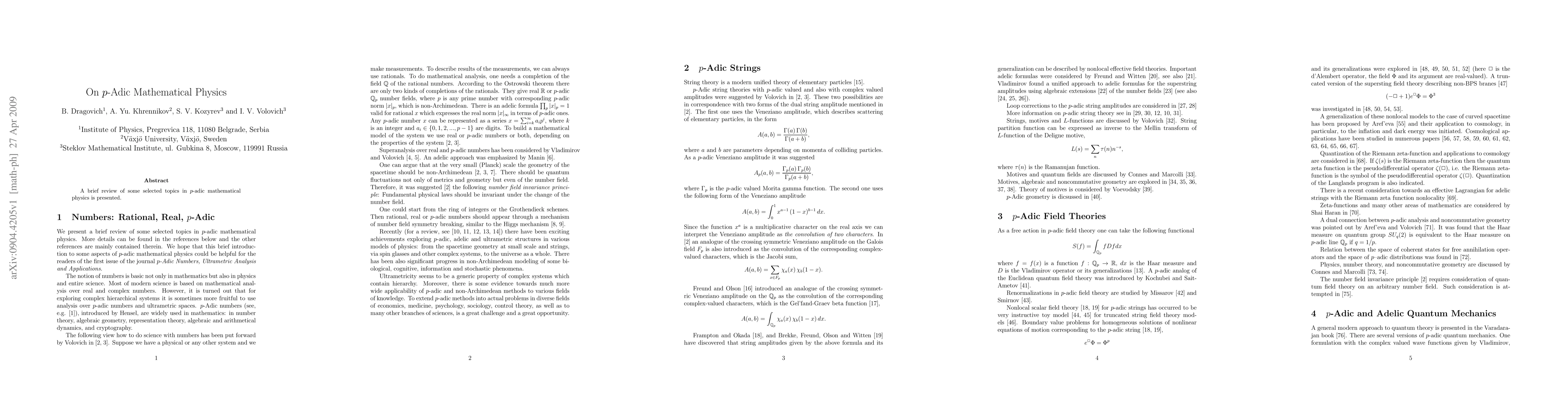 Summary: This paper provides a concise review of selected topics in p-adic mathematical physics, highlighting key concepts and their applications in theoretical frameworks. It emphasizes the unique mathematical structures that arise from p-adic analysis in physical theories.