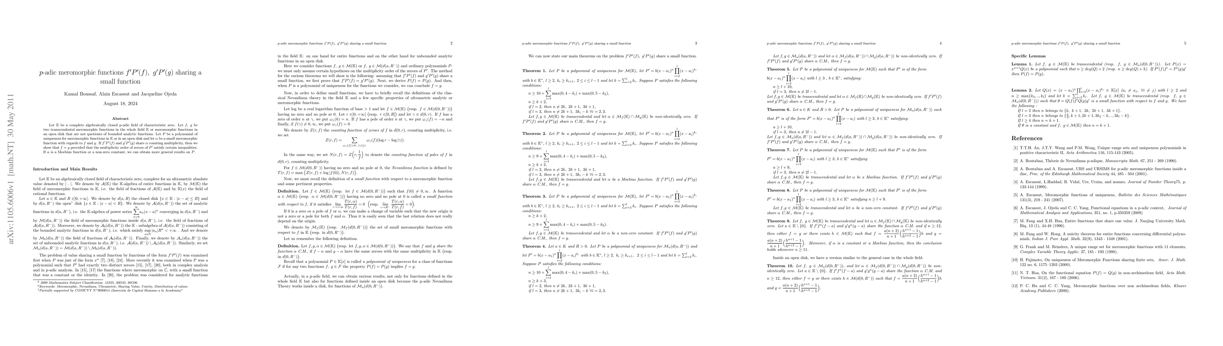 This paper investigates p-adic meromorphic functions that share a small function, proving that if two such functions share a small function in terms of a specific polynomial, they must be identical under certain conditions on the polynomial's zero multiplicity. Results are more general when the shared function is a Möbius transformation or a non-zero constant.
