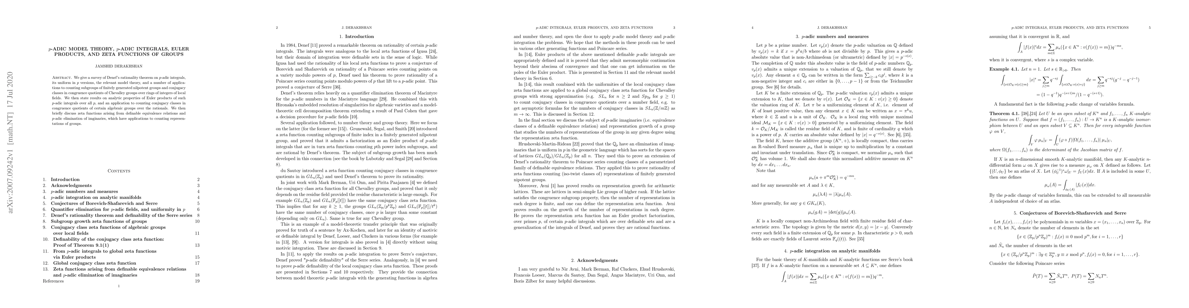 We give a survey of Denef's rationality theorem on $p$-adic integrals, its uniform in $p$ versions, the relevant model theory, and a number of applications to counting subgroups of finitely generated nilpotent groups and conjugacy classes in congruence quotients of Chevalley groups over rings of integers of local fields. We then state results on analytic properties of Euler products of such $p$-adic integrals over all $p$, and an application to counting conjugacy classes in congruence quotients of certain algebraic groups over the rationals. We then briefly discuss zeta functions arising from definable equivalence relations and $p$-adic elimination of imginaries, which have applications to counting representations of groups.