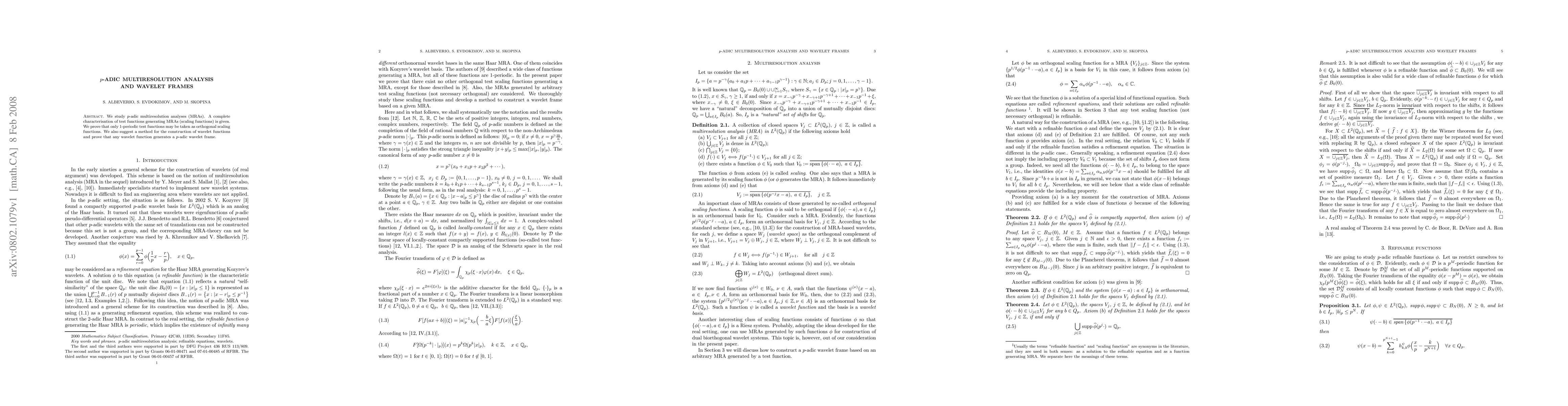 This paper explores $p$-adic multiresolution analyses, providing a full characterization of scaling functions. It concludes that only 1-periodic test functions can serve as orthogonal scaling functions and proposes a method for constructing $p$-adic wavelet functions, demonstrating they generate $p$-adic wavelet frames.