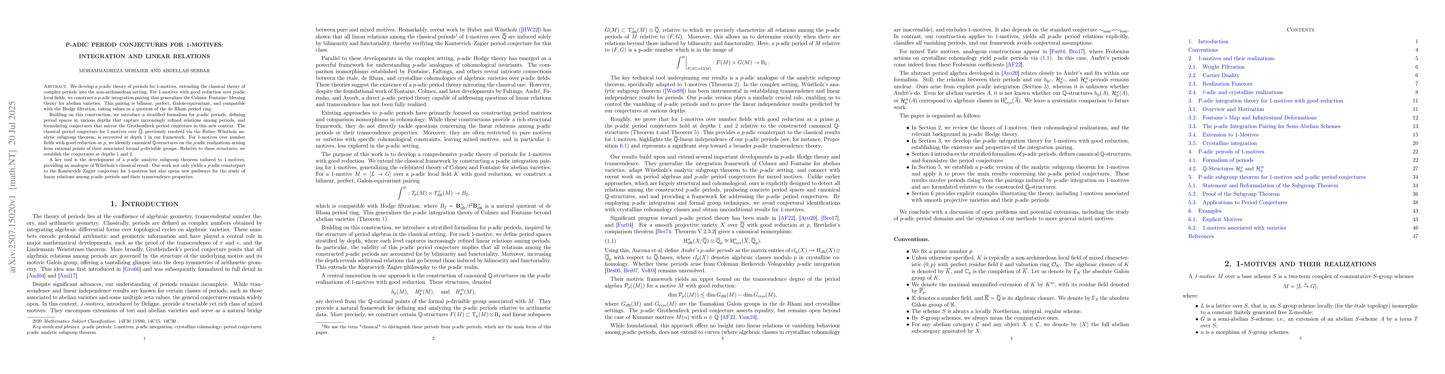 We develop a $p$-adic theory of periods for 1-motives, extending the classical theory of complex periods into the non-archimedean setting. For 1-motives with good reduction over $p$-adic local fields, we construct a $p$-adic integration pairing that generalizes the Colmez--Fontaine--Messing theory for abelian varieties. This pairing is bilinear, perfect, Galois-equivariant, and compatible with the Hodge filtration, taking values in a quotient of the de Rham period ring. Building on this construction, we introduce a stratified formalism for $p$-adic periods, defining period spaces at various depths that capture increasingly refined relations among periods, and formulating conjectures that mirror the Grothendieck period conjecture in this new context. The classical period conjecture for 1-motives over $\bar{Q}$, previously resolved via the Huber--Wustholz analytic subgroup theorem, is recovered at depth 1 in our framework. For 1-motives over number fields with good reduction at $p$, we identify canonical $Q$-structures on the $p$-adic realizations arising from rational points of their associated formal $p$-divisible groups. Relative to these structures, we establish the conjectures at depths 1 and 2. A key tool is the development of a $p$-adic analytic subgroup theorem tailored to 1-motives, providing an analogue of Wustholz's classical result. Our work not only yields a $p$-adic counterpart to the Kontsevich--Zagier conjecture for 1-motives but also opens new pathways for the study of linear relations among $p$-adic periods and their transcendence properties.