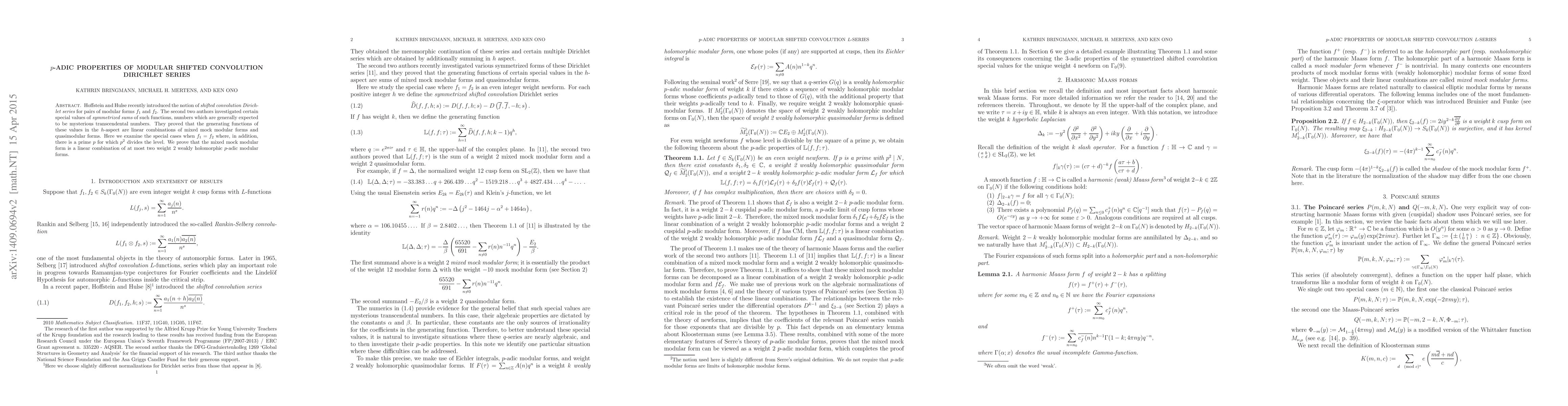 Hoffstein and Hulse recently introduced the notion of shifted convolution Dirichlet series for pairs of modular forms $f_1$ and $f_2$. The second two authors investigated certain special values of symmetrized sums of such functions, numbers which are generally expected to be mysterious transcendental numbers. They proved that the generating functions of these values in $h$-aspect are linear combinations of mixed mock modular forms and quasimodular forms. Here we examine the special cases when $f_1=f_2$ where, in addition, there is a prime $p$ for which $p^2$ divides the level. We prove that the mixed mock modular form is a linear combination of at most two weight 2 weakly holomorphic $p$-adic modular forms.