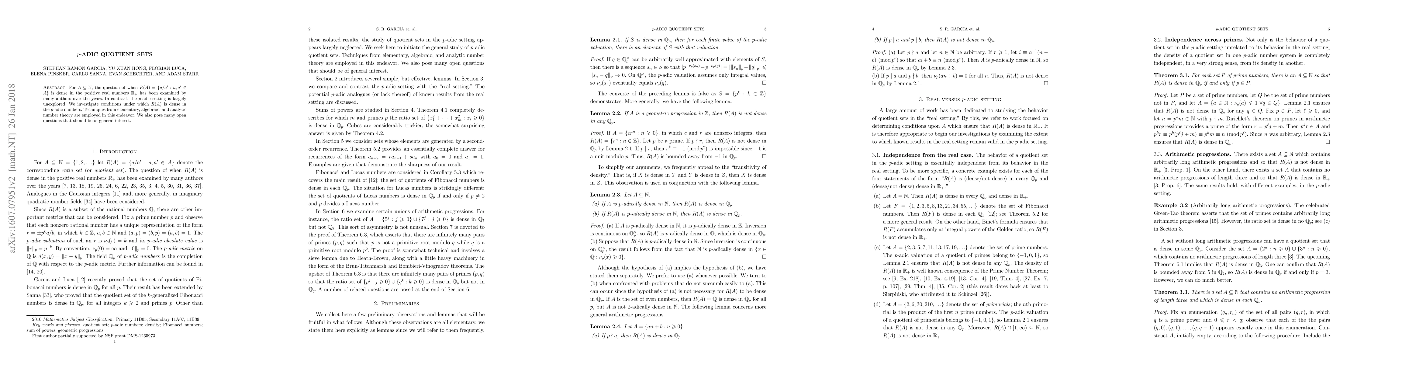 This paper explores conditions for the set $R(A) = \{a/a' : a, a' \in A\}$ to be dense in the $p$-adic numbers, employing techniques from various branches of number theory. It also identifies several open questions in this understudied area.