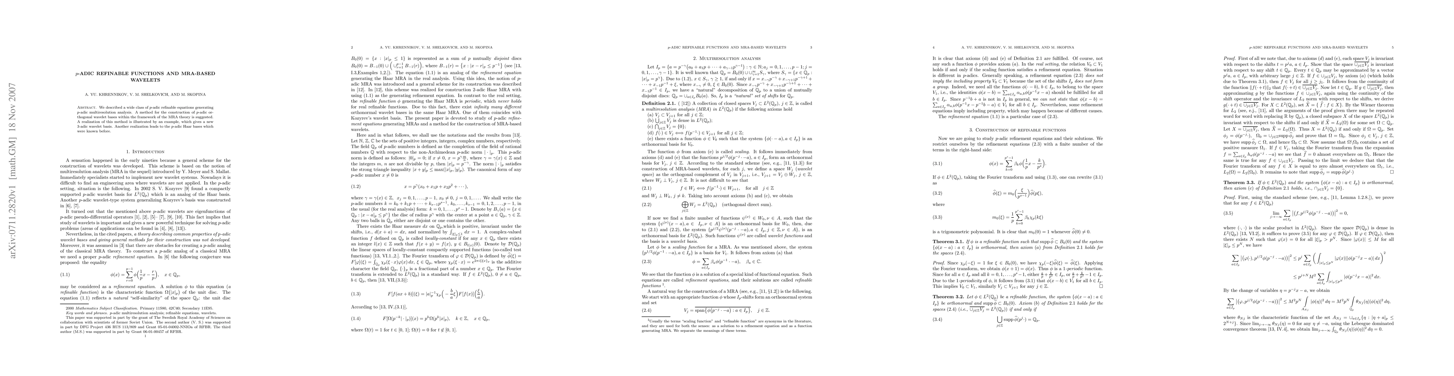 The paper presents a broad class of $p$-adic refinable functions that generate $p$-adic multiresolution analysis (MRA) and introduces a method for constructing $p$-adic orthogonal wavelet bases using MRA theory. An example illustrates a new 3-adic wavelet basis, while another realization produces known $p$-adic Haar bases.