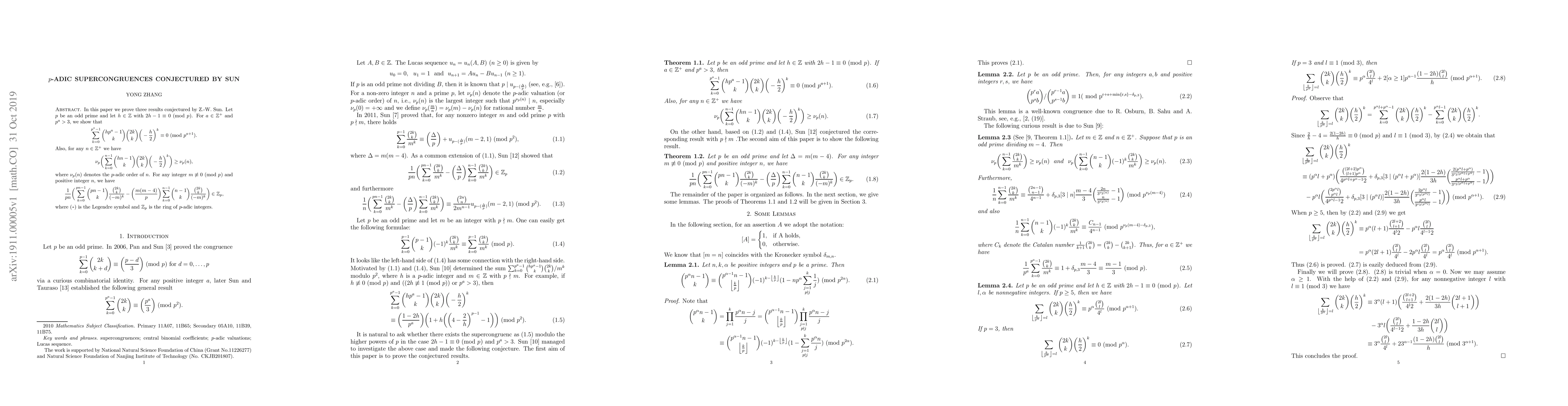 This paper proves three conjectures by Z.-W. Sun concerning $p$-adic supercongruences. It establishes that for certain binomial sums involving $p$-adic orders, the sums are congruent to zero modulo higher powers of $p$, and provides conditions for the $p$-adic valuation of these sums.