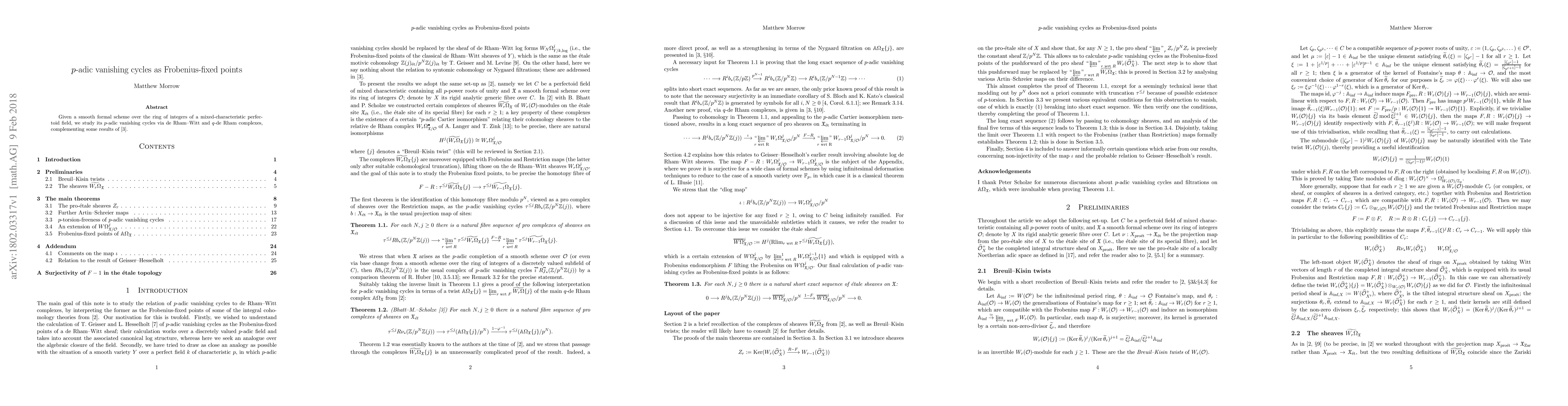 This paper studies $p$-adic vanishing cycles of smooth formal schemes via de Rham-Witt and $q$-de Rham complexes, aiming to understand their connection to Frobenius-fixed points in mixed-characteristic perfectoid fields.