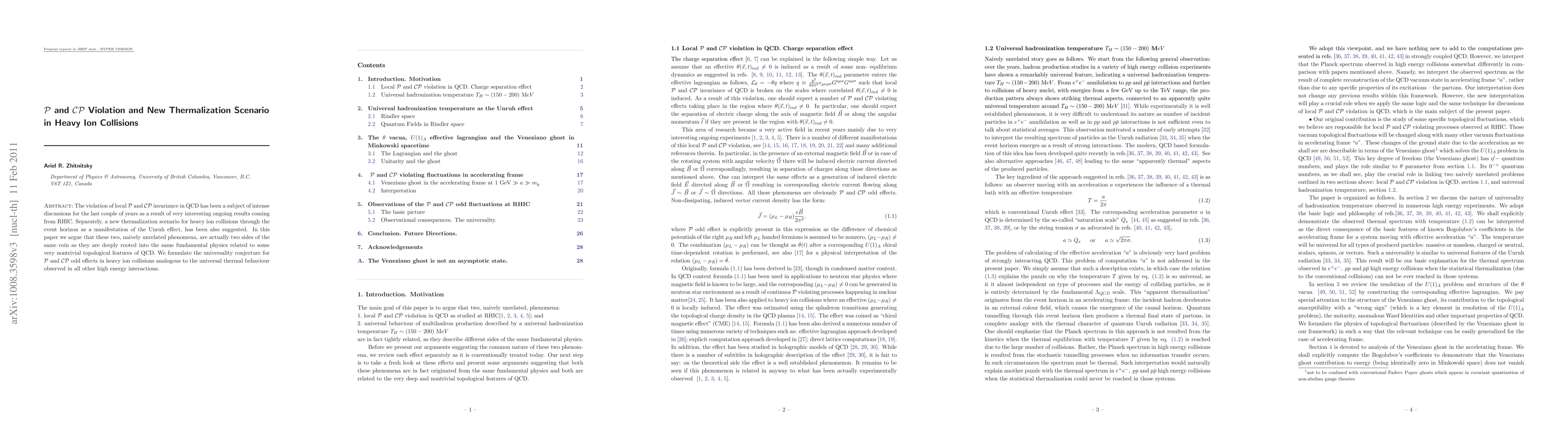 The violation of local P and CP invariance in QCD, as it is observed at RHIC, has been a subject of intense discussions for the last couple of years.Separately, a new thermalization scenario for heavy ion collisions through the event horizon as a manifestation of the Unruh effect, has been also suggested. In this paper we argue that these two, naively unrelated phenomena, are actually two sides of the same coin as they are deeply rooted into the same fundamental physics related to some very nontrivial topological features of QCD. We formulate the universality conjecture for P and CP odd effects in heavy ion collisions analogous to the universal thermal behaviour observed in all other high energy interactions.