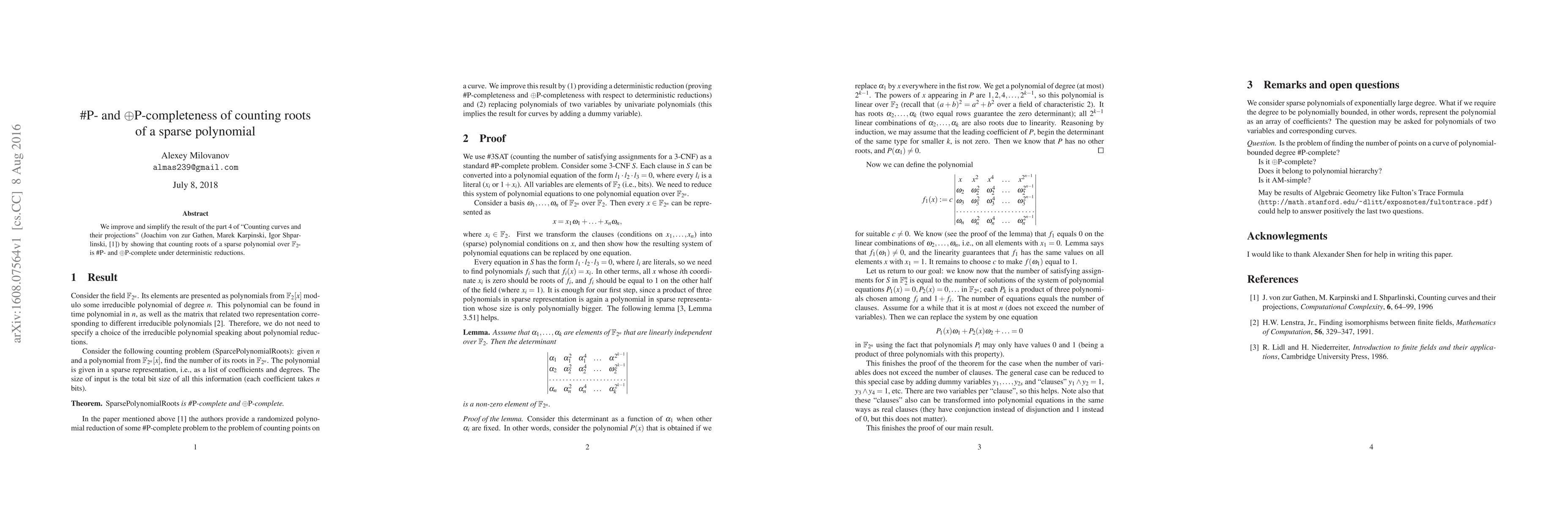 We improve and simplify the result of the part 4 of "Counting curves and their projections" (Joachim von zur Gathen, Marek Karpinski, Igor Shparlinski) by showing that counting roots of a sparse polynomial over $\mathbb{F}_{2^n}$ is #P- and $\oplus$P-complete under deterministic reductions.