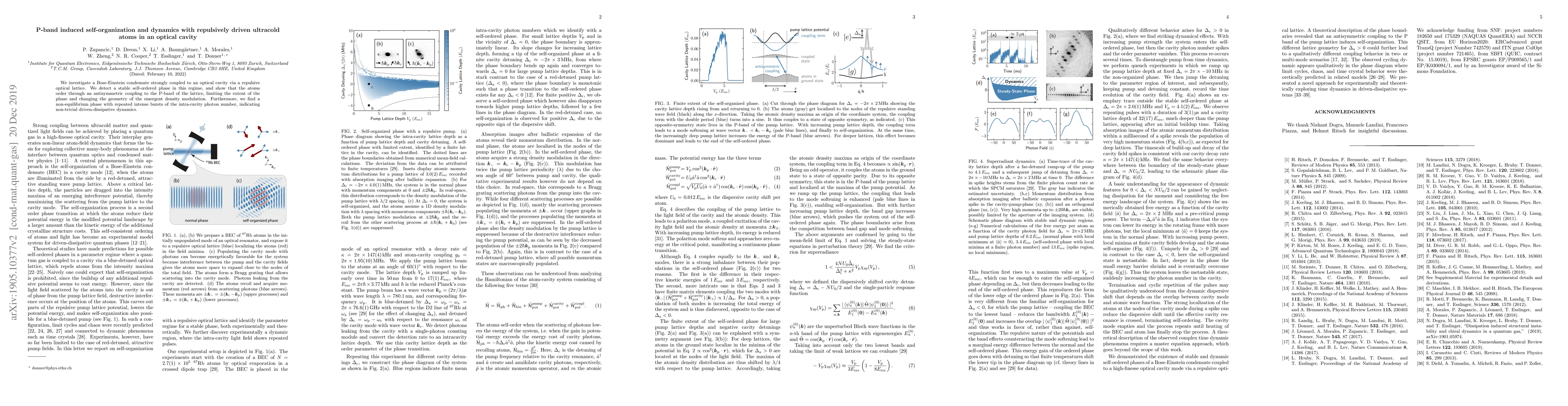 We investigate a Bose-Einstein condensate strongly coupled to an optical cavity via a repulsive optical lattice. We detect a stable self-ordered phase in this regime, and show that the atoms order through an antisymmetric coupling to the P-band of the lattice, limiting the extent of the phase and changing the geometry of the emergent density modulation. Furthermore, we find a non-equilibrium phase with repeated intense bursts of the intra-cavity photon number, indicating non-trivial driven-dissipative dynamics.