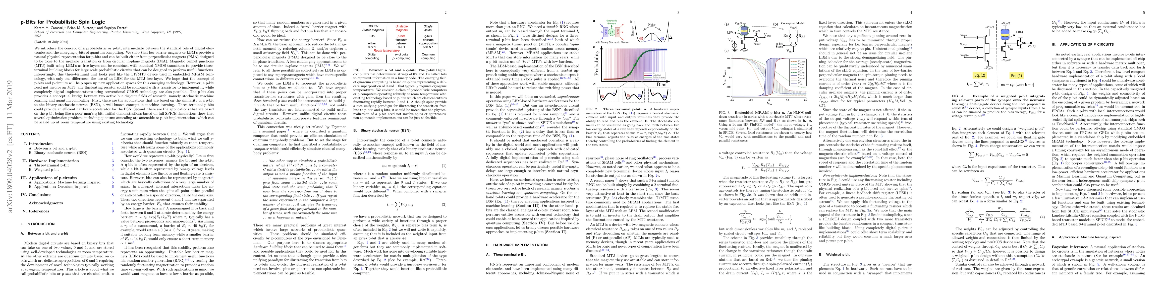 The paper introduces p-bits, a probabilistic intermediate between standard bits and q-bits, represented by low barrier magnets and implemented using magnetic tunnel junctions. This technology bridges stochastic machine learning and quantum computing, offering scalable room-temperature solutions for optimization problems.