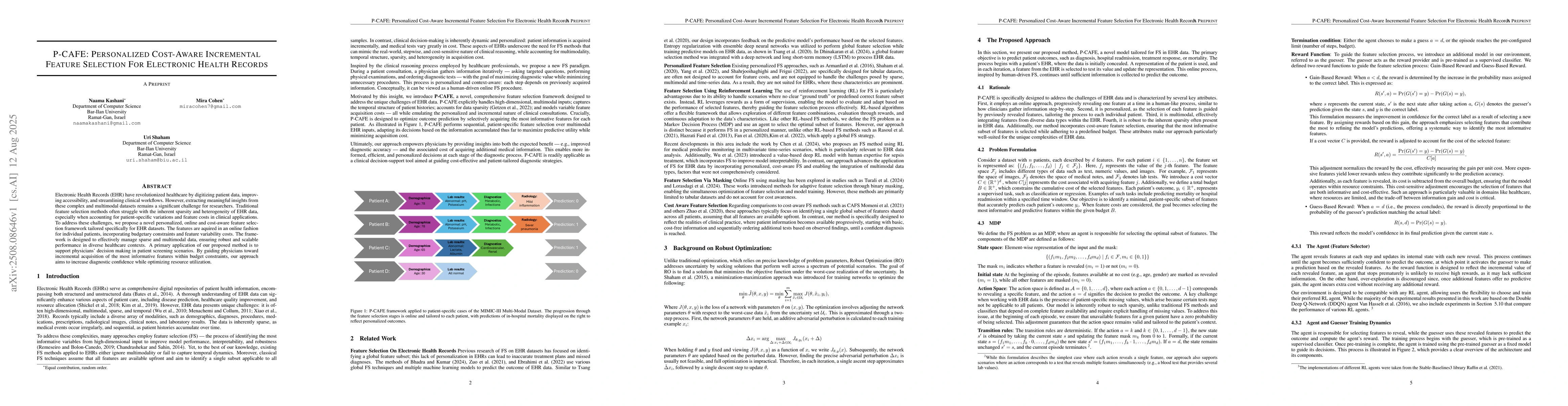 Electronic Health Records (EHR) have revolutionized healthcare by digitizing patient data, improving accessibility, and streamlining clinical workflows. However, extracting meaningful insights from these complex and multimodal datasets remains a significant challenge for researchers. Traditional feature selection methods often struggle with the inherent sparsity and heterogeneity of EHR data, especially when accounting for patient-specific variations and feature costs in clinical applications. To address these challenges, we propose a novel personalized, online and cost-aware feature selection framework tailored specifically for EHR datasets. The features are aquired in an online fashion for individual patients, incorporating budgetary constraints and feature variability costs. The framework is designed to effectively manage sparse and multimodal data, ensuring robust and scalable performance in diverse healthcare contexts. A primary application of our proposed method is to support physicians' decision making in patient screening scenarios. By guiding physicians toward incremental acquisition of the most informative features within budget constraints, our approach aims to increase diagnostic confidence while optimizing resource utilization.