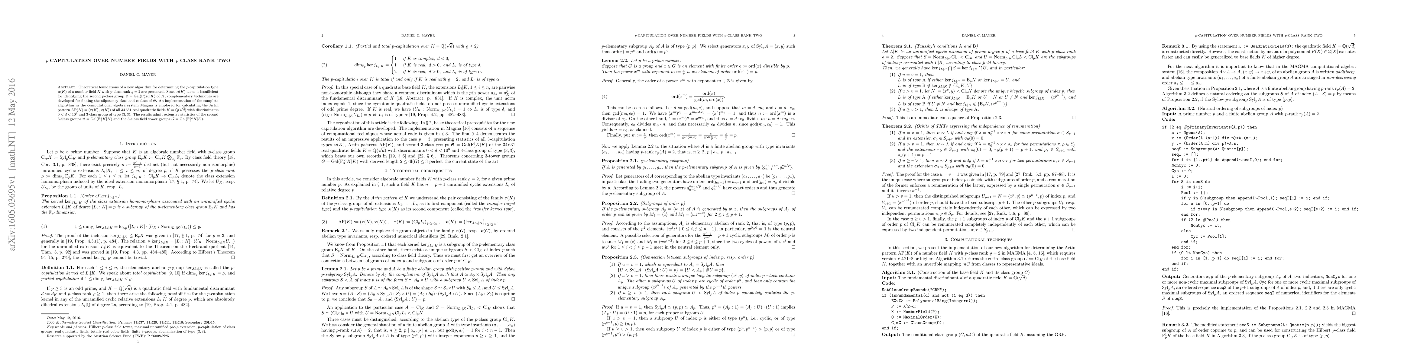 This paper introduces a new algorithm for determining the p-capitulation type kappa(K) of number fields K with p-class rank rho=2, complemented by techniques for identifying the nilpotency class and coclass of the second p-class group. The algorithm's implementation in Magma calculates the Artin pattern for all 34631 real quadratic fields with specific discriminants.