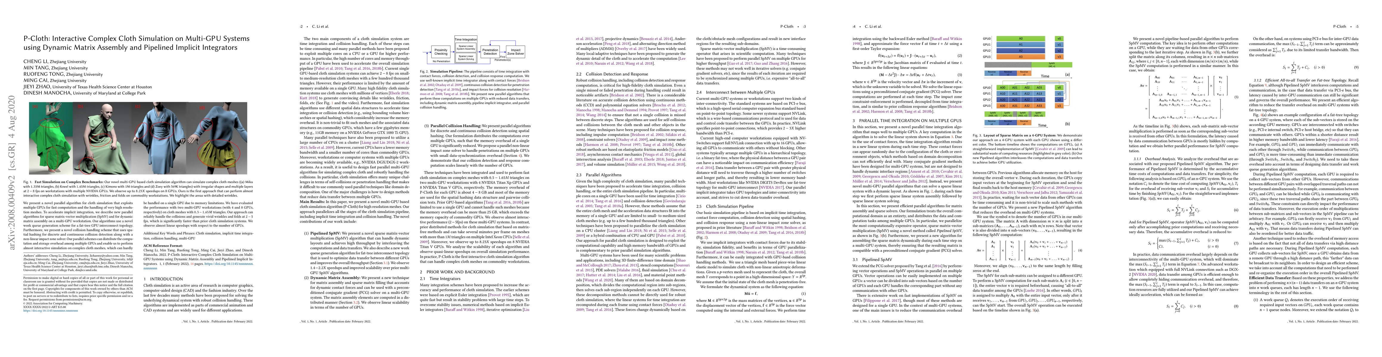 This paper introduces a parallel algorithm for high-resolution cloth simulation on multi-GPU systems using dynamic matrix assembly and pipelined implicit integrators. The authors achieve near-interactive performance by distributing computation and storage across multiple GPUs, enabling the handling of complex cloth meshes with high triangle counts.