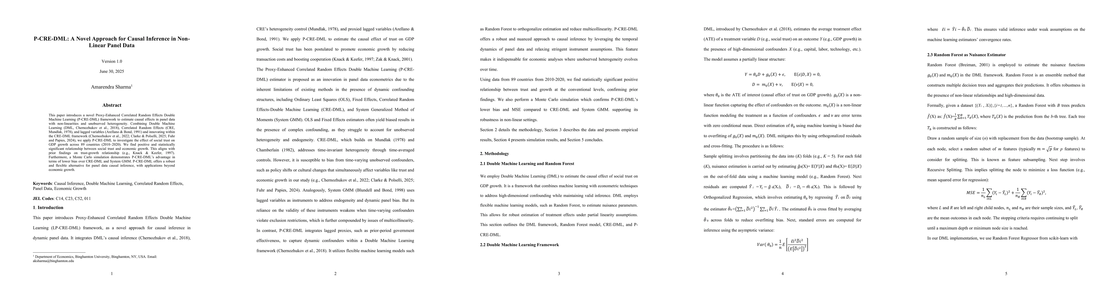 This paper introduces a novel Proxy-Enhanced Correlated Random Effects Double Machine Learning (P-CRE-DML) framework to estimate causal effects in panel data with non-linearities and unobserved heterogeneity. Combining Double Machine Learning (DML, Chernozhukov et al., 2018), Correlated Random Effects (CRE, Mundlak, 1978), and lagged variables (Arellano & Bond, 1991) and innovating within the CRE-DML framework (Chernozhukov et al., 2022; Clarke & Polselli, 2025; Fuhr & Papies, 2024), we apply P-CRE-DML to investigate the effect of social trust on GDP growth across 89 countries (2010-2020). We find positive and statistically significant relationship between social trust and economic growth. This aligns with prior findings on trust-growth relationship (e.g., Knack & Keefer, 1997). Furthermore, a Monte Carlo simulation demonstrates P-CRE-DML's advantage in terms of lower bias over CRE-DML and System GMM. P-CRE-DML offers a robust and flexible alternative for panel data causal inference, with applications beyond economic growth.