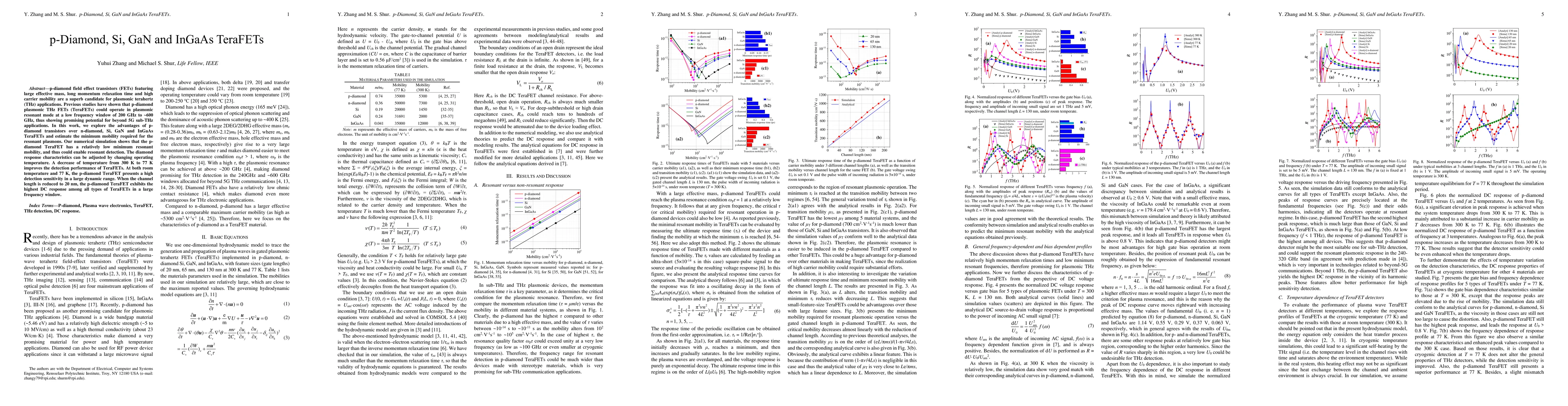 p-diamond field effect transistors (FETs) featuring large effective mass, long momentum relaxation time and high carrier mobility are a superb candidate for plasmonic terahertz (THz) applications. Previous studies have shown that p-diamond plasmonic THz FETs (TeraFETs) could operate in plasmonic resonant mode at a low frequency window of 200 GHz to ~600 GHz, thus showing promising potential for beyond 5G sub-THz applications. In this work, we explore the advantages of p-diamond transistors over n-diamond, Si, GaN and InGaAs TeraFETs and estimate the minimum mobility required for the resonant plasmons. Our numerical simulation shows that the p-diamond TeraFET has a relatively low minimum resonant mobility, and thus could enable resonant detection. The diamond response characteristics can be adjusted by changing operating temperature. A decrease of temperature from 300 K to 77 K improves the detection performance of TeraFETs. At both room temperature and 77 K, the p-diamond TeraFET presents a high detection sensitivity in a large dynamic range. When the channel length is reduced to 20 nm, the p-diamond TeraFET exhibits the highest DC response among all types of TeraFETs in a large frequency window.
