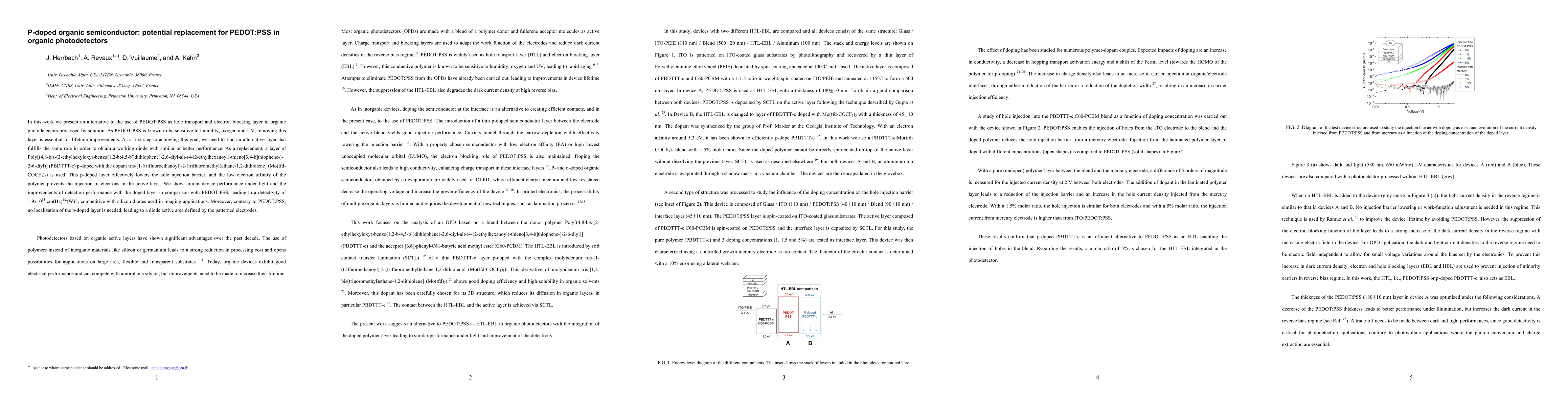 In this work we present an alternative to the use of PEDOT:PSS as hole transport and electron blocking layer in organic photodetectors processed by solution. As PEDOT:PSS is known to be sensitive to humidity, oxygen and UV, removing this layer is essential for lifetime improvements. As a first step to achieving this goal, we need to find an alternative layer that fulfills the same role in order to obtain a working diode with similar or better performance. As a replacement, a layer of Poly((4,8-bis-(2-ethylhexyloxy)-benzo(1,2-b:4,5-b)dithiophene)-2,6-diyl-alt-(4-(2-ethylhexanoyl)-thieno(3,4-b]thiophene-)-2-6-diyl)) (PBDTTT-c) p-doped with the dopant tris-(1-(trifluoroethanoyl)-2-(trifluoromethyl)ethane-1,2-dithiolene) (Mo(tfd-COCF3)3) is used. This p-doped layer effectively lowers the hole injection barrier, and the low electron affinity of the polymer prevents the injection of electrons in the active layer. We show similar device performance under light and the improvements of detection performance with the doped layer in comparison with PEDOT:PSS, leading to a detectivity of 1.9x1E13 cm(Hz)1/2(W)-1, competitive with silicon diodes used in imaging applications. Moreover, contrary to PEDOT:PSS, no localization of the p-doped layer is needed, leading to a diode active area defined by the patterned electrodes.
