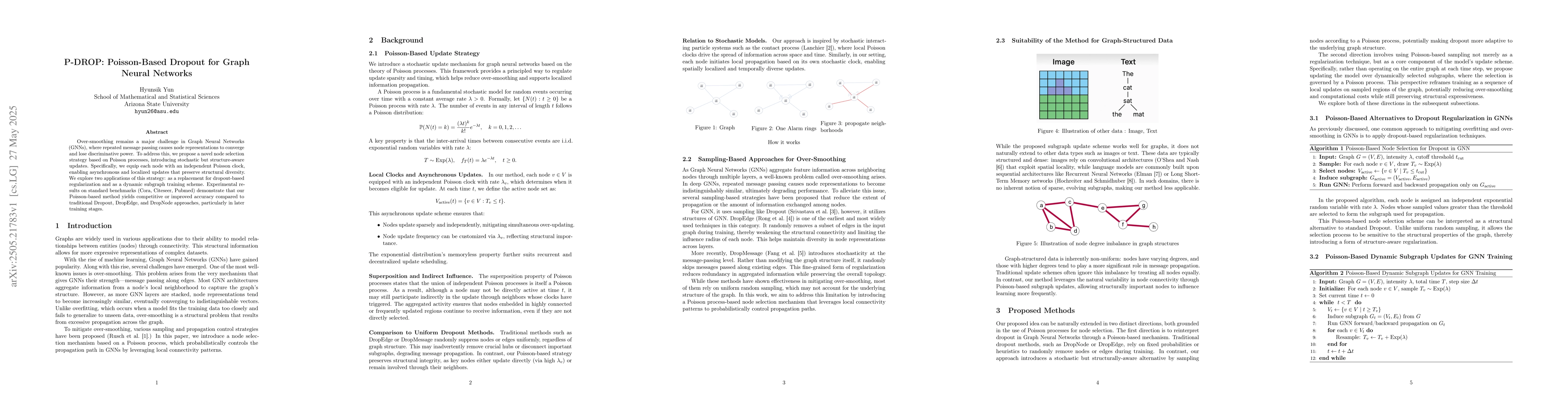 Over-smoothing remains a major challenge in Graph Neural Networks (GNNs), where repeated message passing causes node representations to converge and lose discriminative power. To address this, we propose a novel node selection strategy based on Poisson processes, introducing stochastic but structure-aware updates. Specifically, we equip each node with an independent Poisson clock, enabling asynchronous and localized updates that preserve structural diversity. We explore two applications of this strategy: as a replacement for dropout-based regularization and as a dynamic subgraph training scheme. Experimental results on standard benchmarks (Cora, Citeseer, Pubmed) demonstrate that our Poisson-based method yields competitive or improved accuracy compared to traditional Dropout, DropEdge, and DropNode approaches, particularly in later training stages.