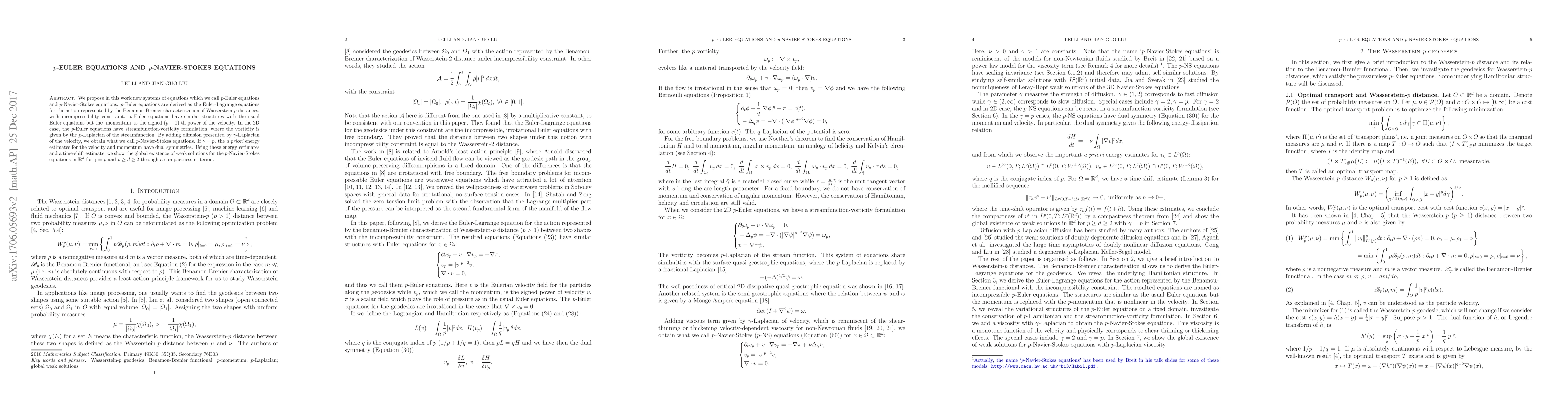 We propose in this work new systems of equations which we call $p$-Euler equations and $p$-Navier-Stokes equations. $p$-Euler equations are derived as the Euler-Lagrange equations for the action represented by the Benamou-Brenier characterization of Wasserstein-$p$ distances, with incompressibility constraint. $p$-Euler equations have similar structures with the usual Euler equations but the `momentum' is the signed ($p-1$)-th power of the velocity. In the 2D case, the $p$-Euler equations have streamfunction-vorticity formulation, where the vorticity is given by the $p$-Laplacian of the streamfunction. By adding diffusion presented by $\gamma$-Laplacian of the velocity, we obtain what we call $p$-Navier-Stokes equations. If $\gamma=p$, the {\it a priori} energy estimates for the velocity and momentum have dual symmetries. Using these energy estimates and a time-shift estimate, we show the global existence of weak solutions for the $p$-Navier-Stokes equations in $\mathbb{R}^d$ for $\gamma=p$ and $p\ge d\ge 2$ through a compactness criterion.
