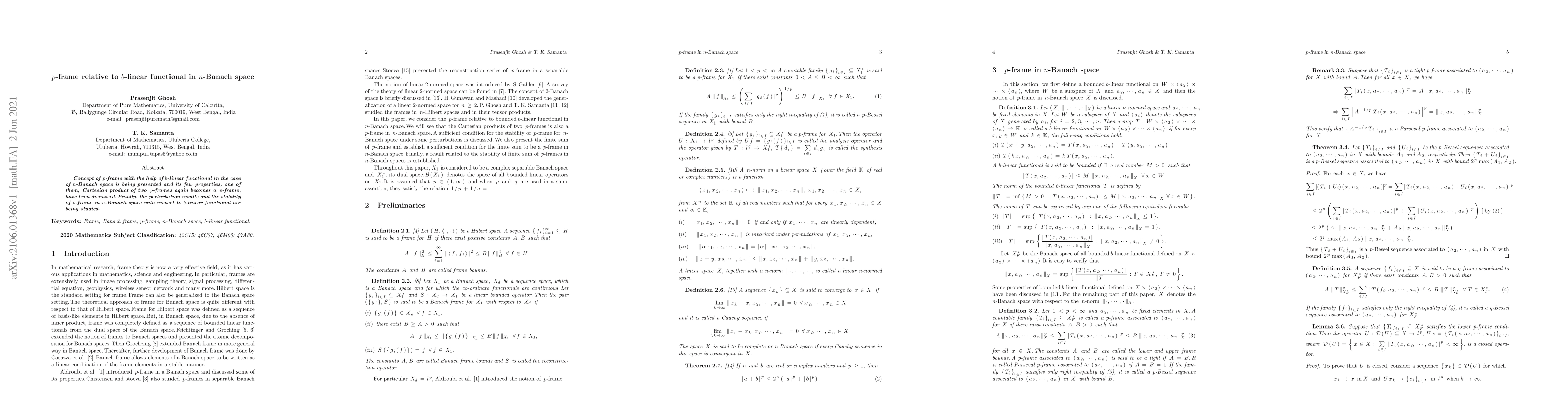 This paper introduces a concept of p-frame in n-Banach space with a b-linear functional, exploring its properties, such as the stability of p-frames under perturbations.